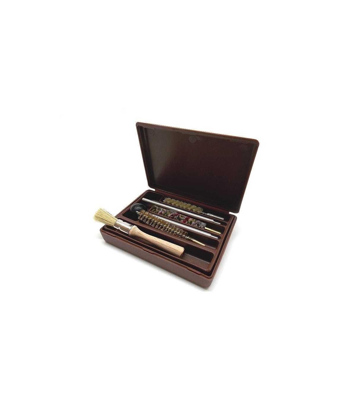 CLEANING KIT IN ABS PLASTIC BROWN BOX WITH TWO PIECES ALUMINIUM ROD, WOOL, NYLON AND BRASS BRUSHES, SMALL BRUSH WITH WOODEN AND NATURAL SILK HANDLE FOR GUN AND REVOLVER