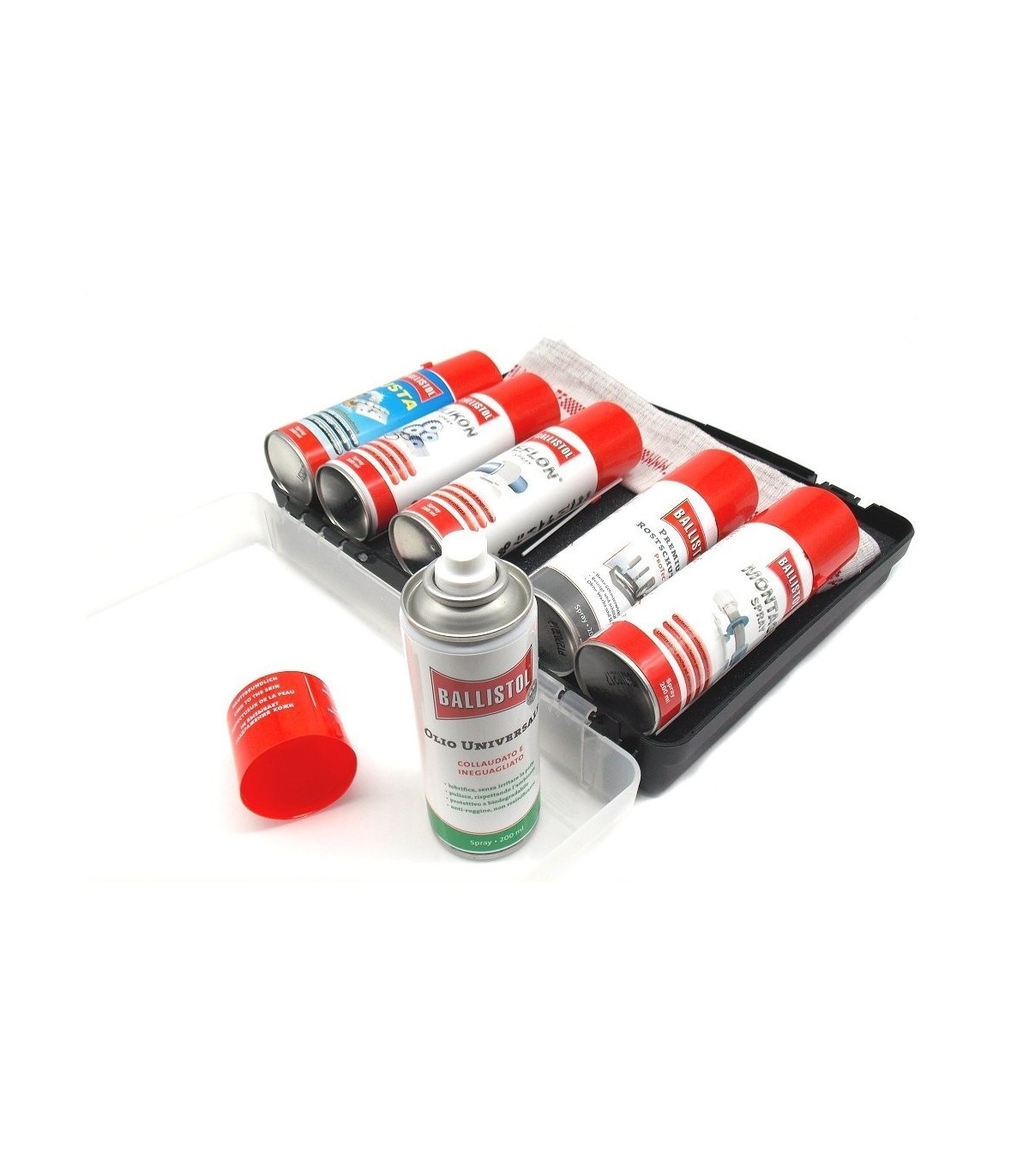 Il Kit contiene: olio spray Ballistol universale da 200 ml, Ballistol teflon spray da 200 ml Lubrificazione a secco), olio per officina Usta spray da 200 ml, Protec spray da 200 ml (olio multifunzione senza cera), spray al silicone 200 ml, spray per montaggio 200 ml