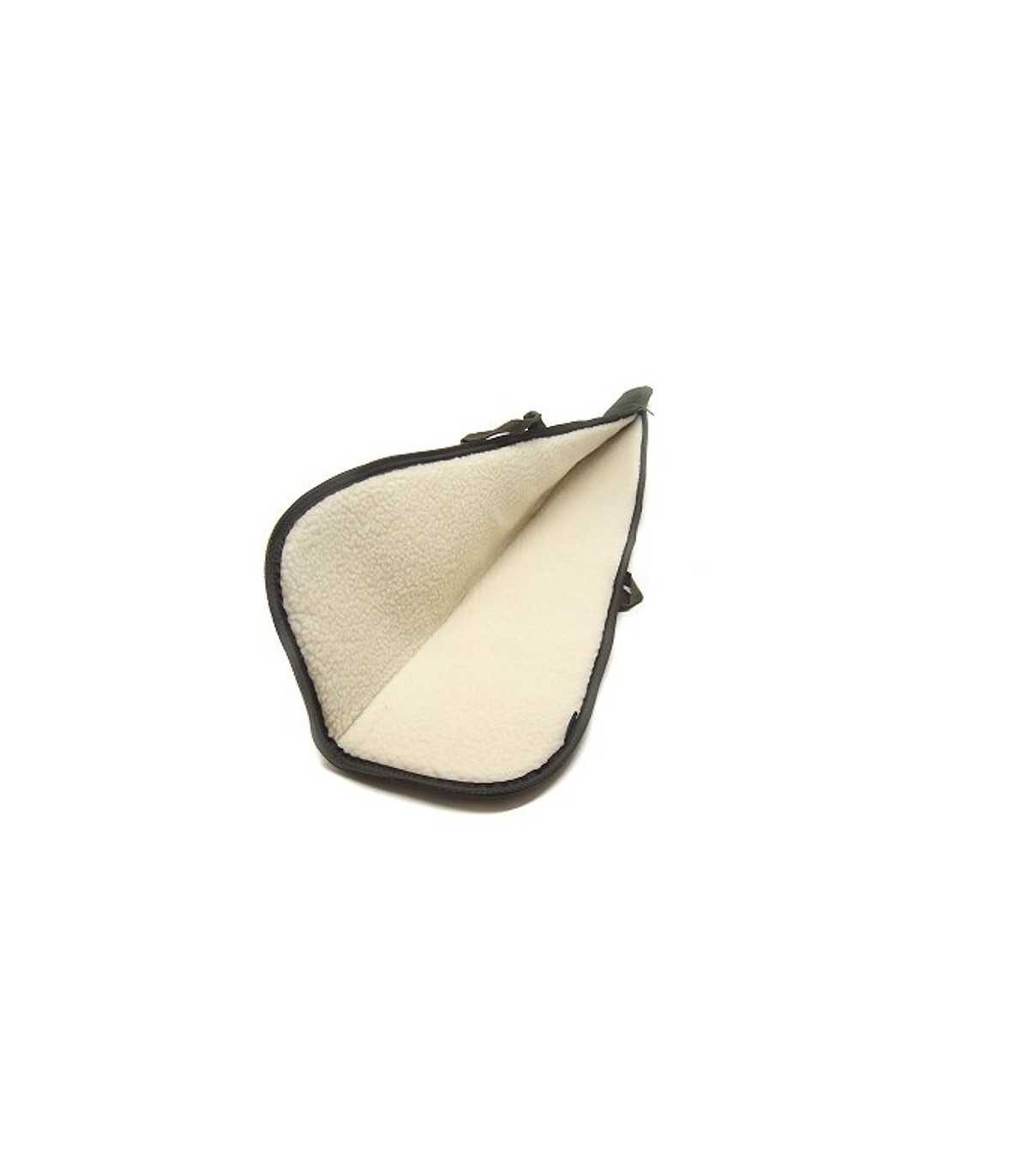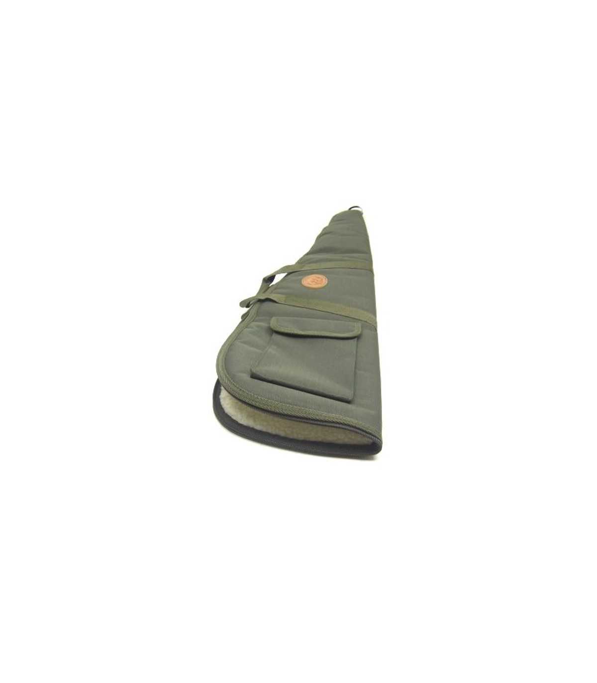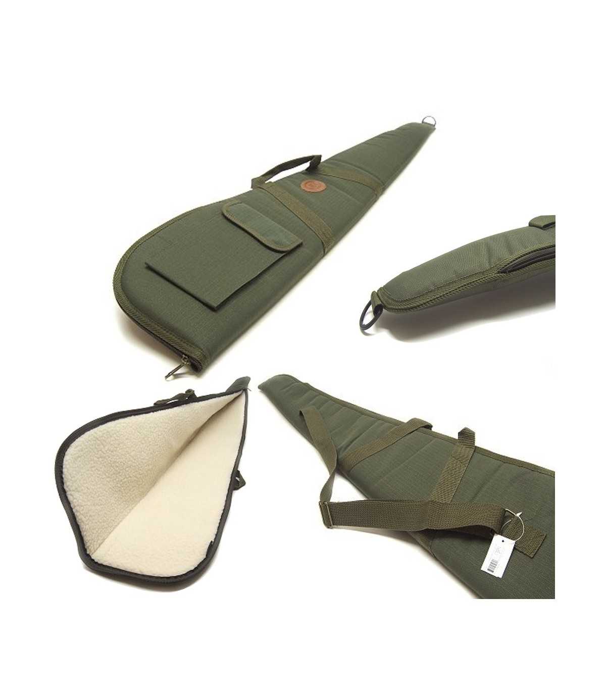 Green nylon rifle case with inner white teddy-patterned soft polyester fabric, a pocket, adjustable shoulder strap