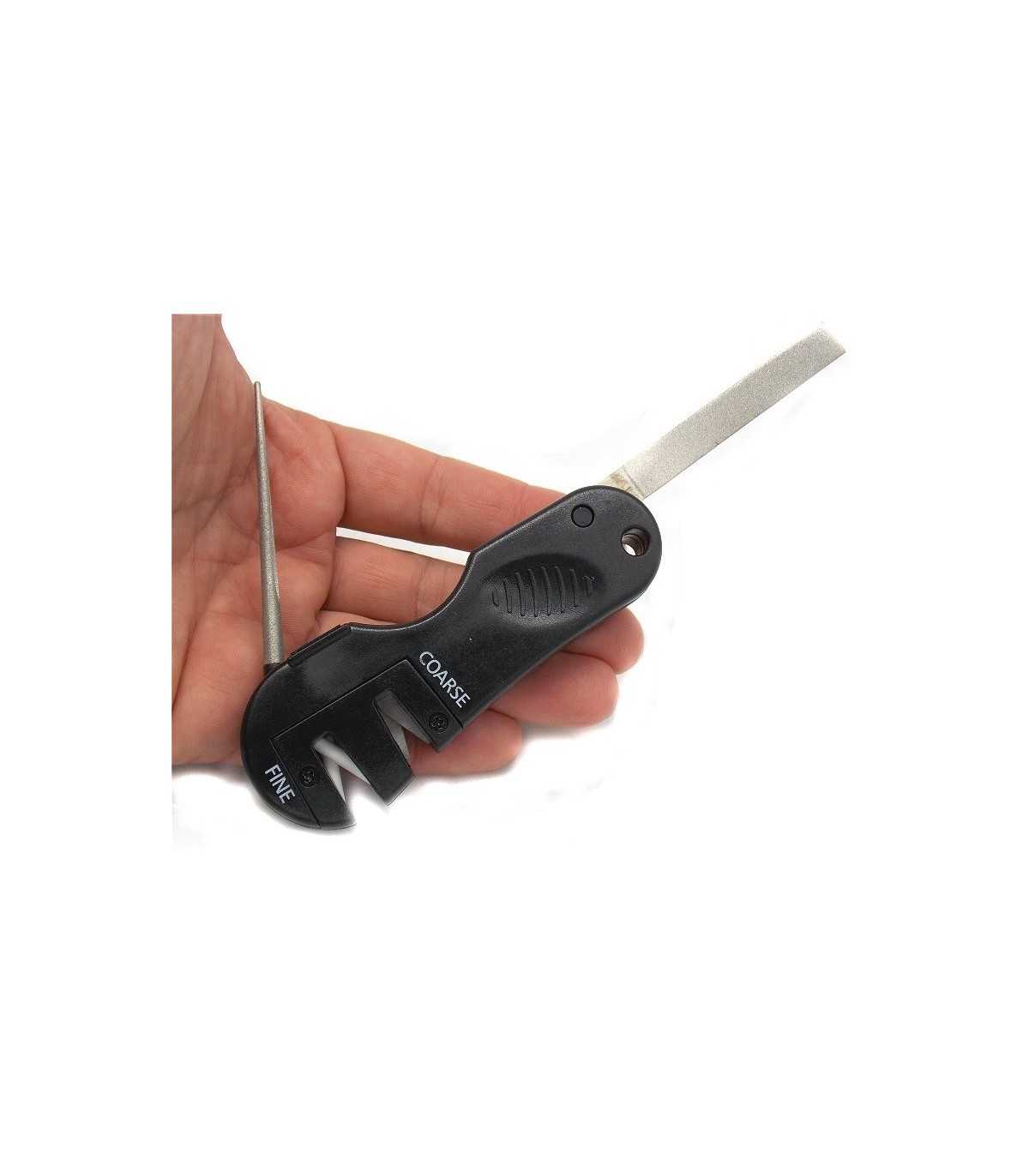 The knife sharpener has four sharpeners in a single body that can be inserted into a pocket. Possibility to sharpen both fine and coarse-grained knives. Two surfaces open from the body: a flat file on one side and a tapered file on the other. Length 10.5 cm, maximum width 3.5 cm. Black colour.