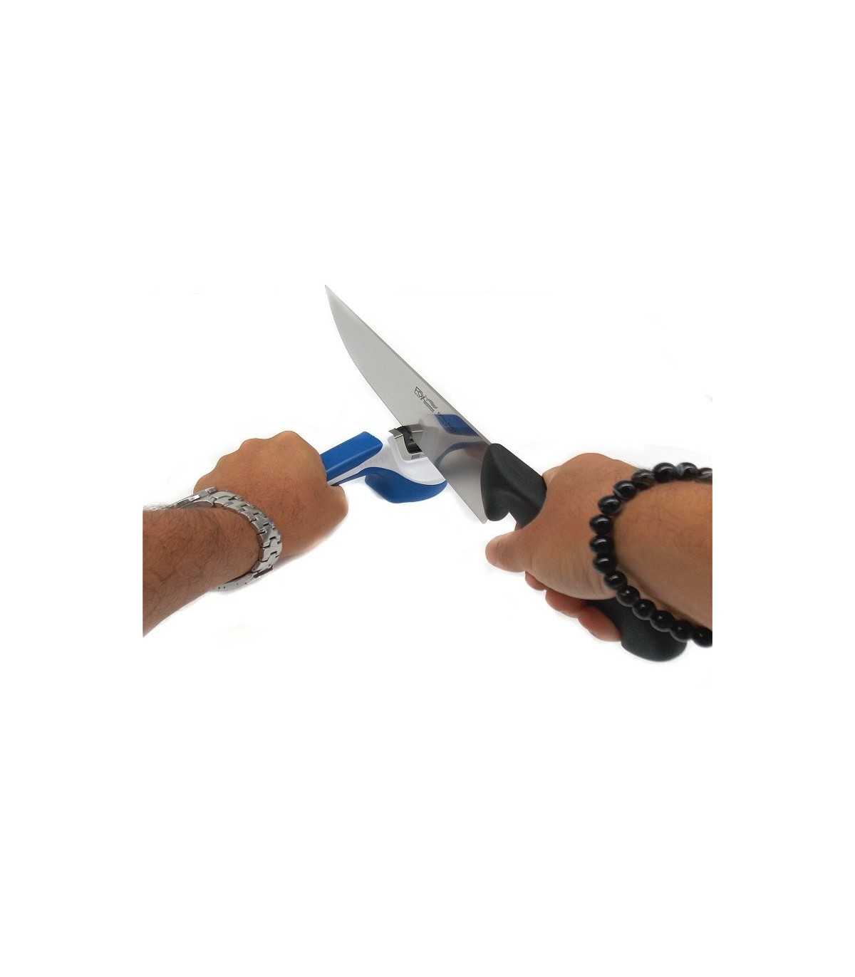 Equipped with crossed rods in diamond stone (coarse sharpening) and ceramic (finer sharpening) for perfect sharpening and smoothing. Width 21 cm, height 7 cm. Plastic body, handle with non-slip. Made in the USA.