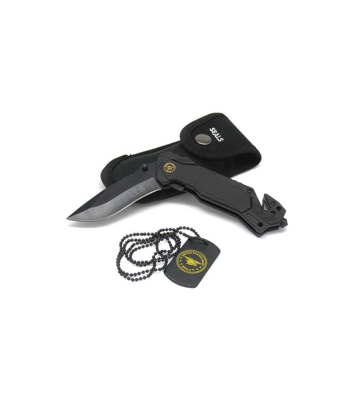 Blade length 8 cm, blade width max 2.5 cm, total length open 20 cm. Equipped with black canvas sheath with belt loops 7 cm high, with blade lock, glassbreaker and belt-size. Blade in black steel. Non-slip rubberized handle. With clips to put it on the belt. A chain with a plate is supplied.
