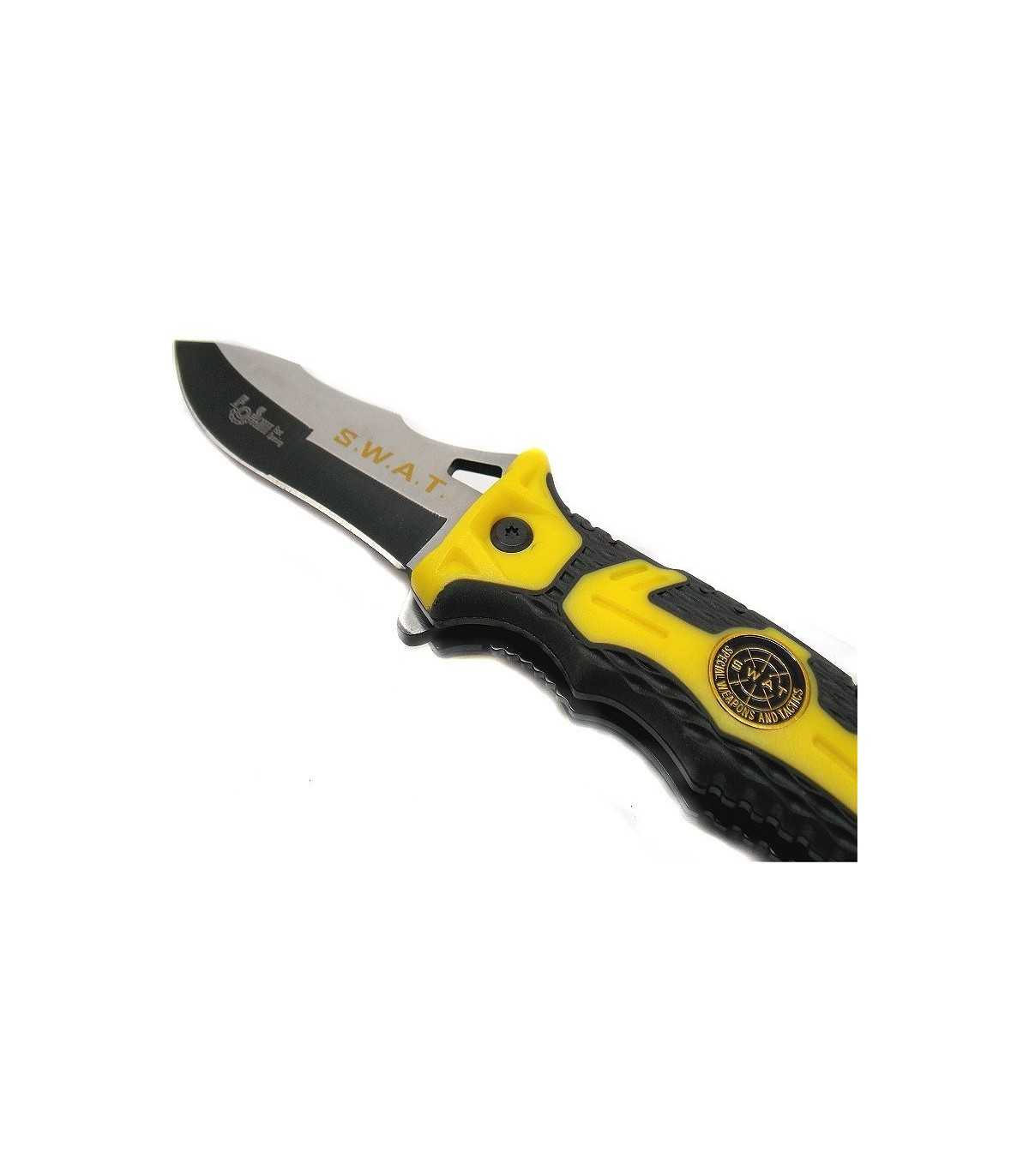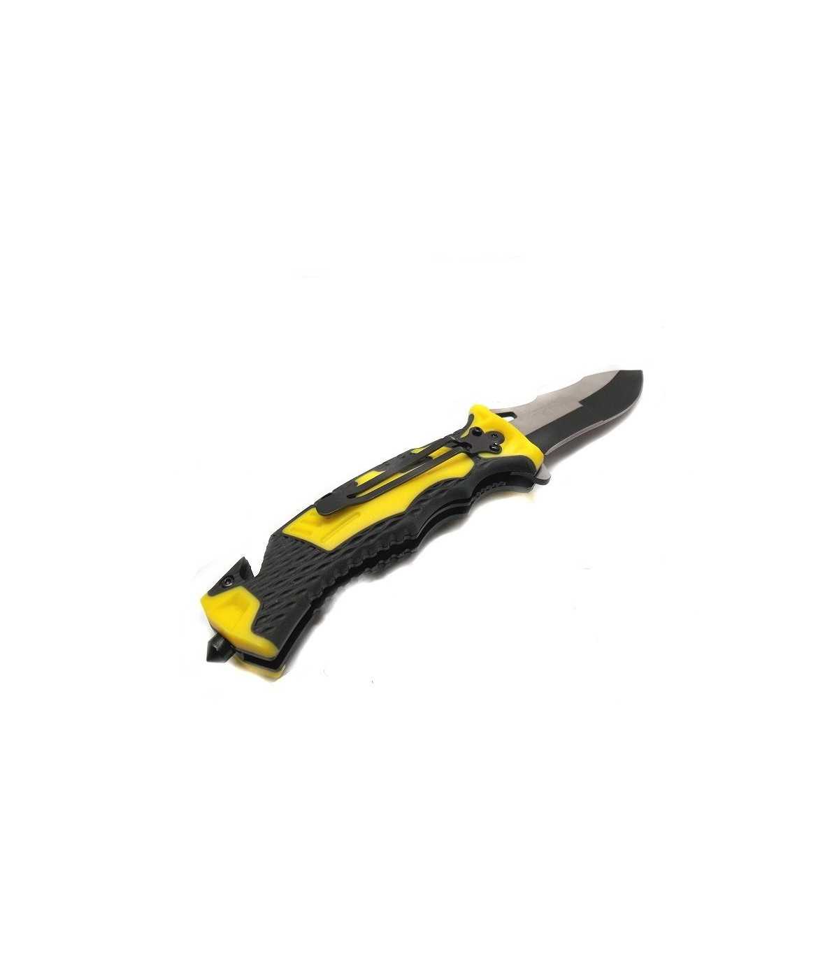 Blade length 8.5 cm, blade width maximum 2.8 cm, total length open 21.5 cm. Equipped with black canvas sheath with belt loops 7 cm high, with blade lock, quick opening, glassbreaker and belt size. Steel blade. Non-slip rubberized handle. With clips to put it on the belt.