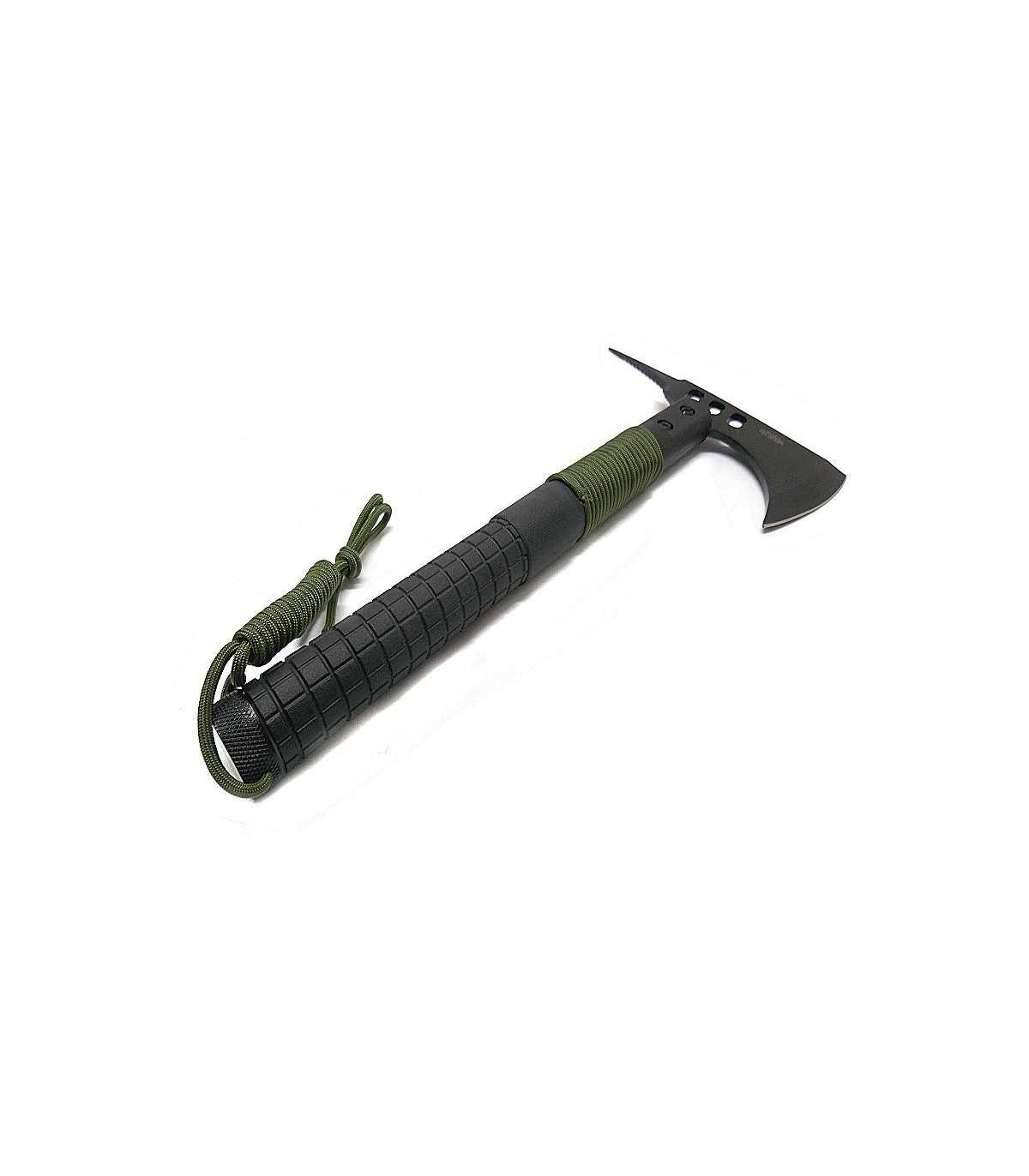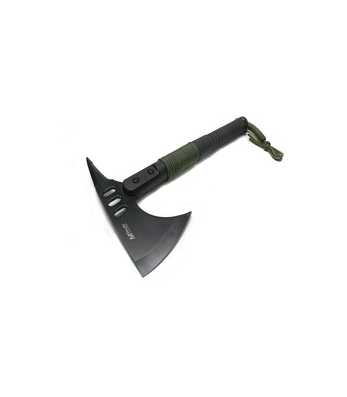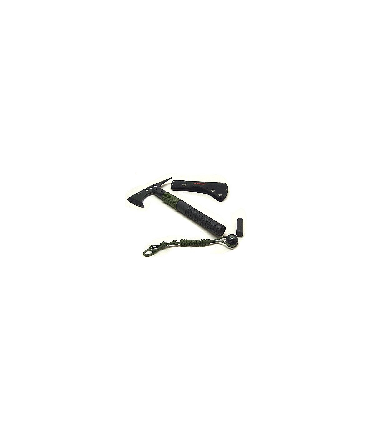 WORK AXE. MTECH HATCHET WITH COMPASS IN THE HANDLE, STAINLESS STEEL TITANIUM COVERED BLADE, AND SURVIVAL KIT. COMES WITH BLACK NYLON SHEATH. TOTAL LENGTH: CM 37.5. BLADE WIDTH: CM 19.