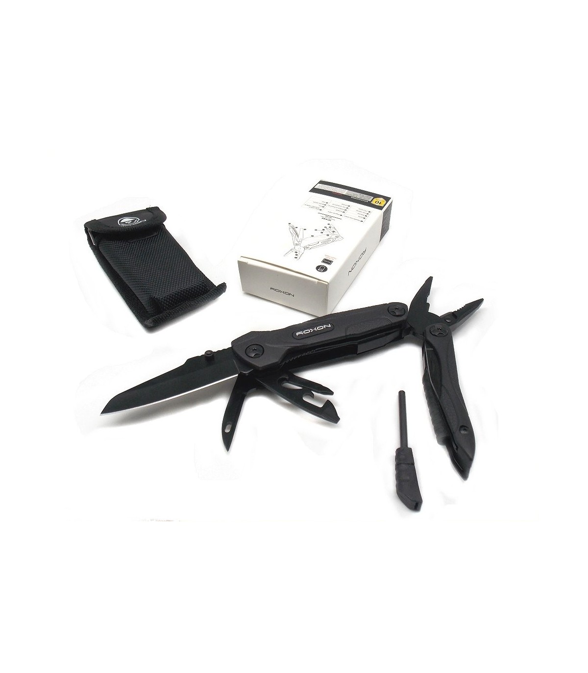 Pinza in metallo nero con 14 funzioni: sega, coltello, apriscatole, apribottiglie, cacciavite piatto, cacciavite phillips, pinze ad ago, pinze regolari, tronchesi (materiale morbido/duro), pietra focaia, fischietto, alesatore, raschietto e punteruolo