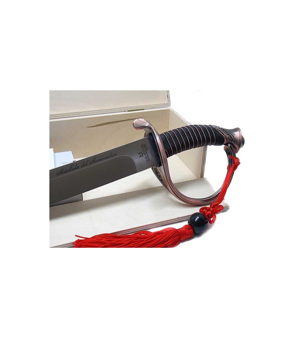 Kitchen knife. FOX SOMMELIER SABRE WITH COPPER HANDLE, RED CANVAS PENDANT. FOX SOMMELIER SABRE OPENS OF A BOTTLE OF SPARKLING WINE. COMES WITH WOODEN CASE, PARCHMENT WITH ISTRUCTIONS, WOODEN SUPPORT. THIS THE OFFICIAL SABRE OF THE CONFRÃRIE DU SABRE Dââ¬âââ¬Å¾¢OR STARTED IN FRANCE IN 1986. BLADE LENGTH: CM 39.5. BLADE WIDTH: CM 3.8. TOTAL LENGTH: CM 53.5. MADE IN ITALY.
