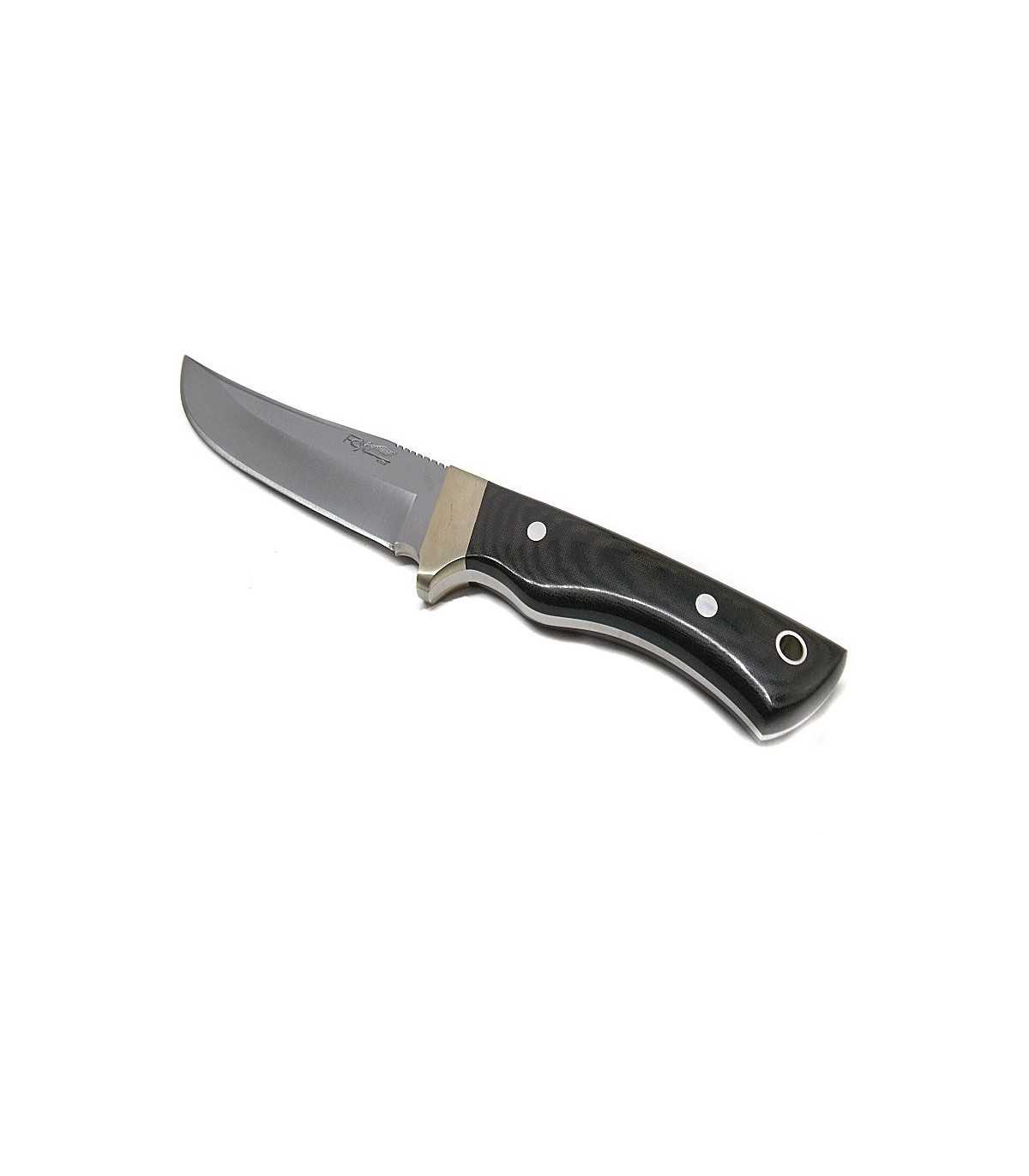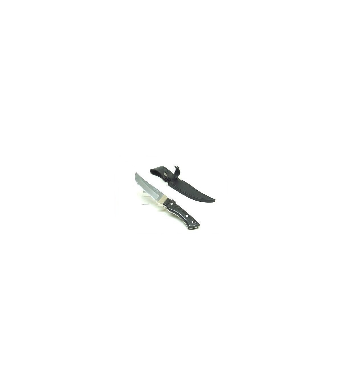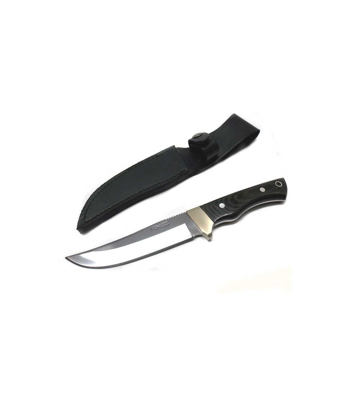 FOX KNIFE WITH BLADE MADE OF STEEL TITANIUM NITRIDE CARBONITRIDE COVERED AND EBONY HANDLE. SURFACE HARDNESS GRADE OF 2900/3000HV (VICKERS SCALE). COMES WITH BLACK LEATHER SHEATH. FIXED BLADE LENGTH: CM 13. BLADE WIDTH: CM 3. TOTAL LENGTH: CM 26.