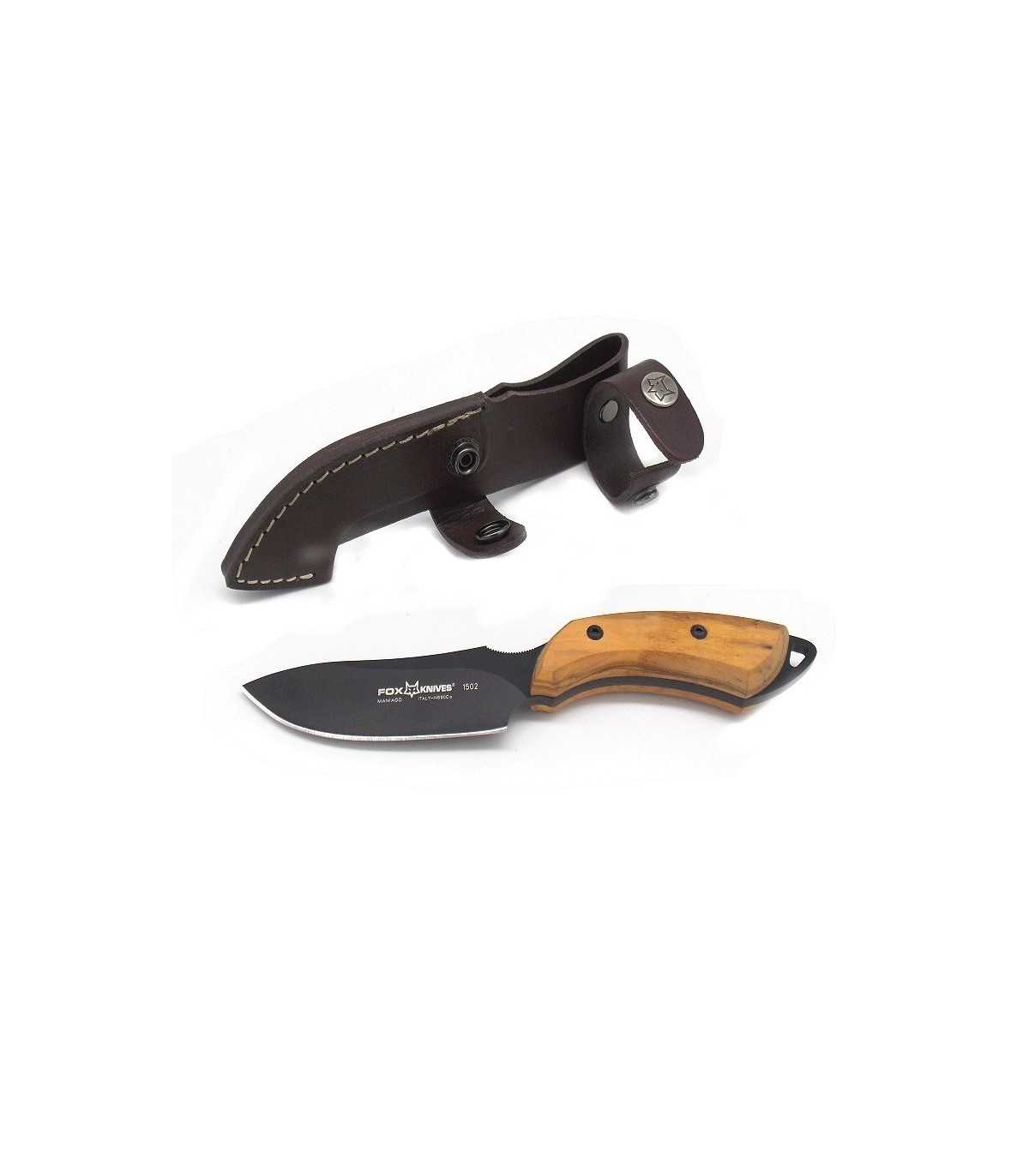 Sports knife. Blade length 9 cm, maximum blade width 3 cm, total length 19.5 cm. Fixed blade in burnished steel. Equipped with brown leather sheath, with belt loop 7 cm high. Finely crafted olive handle. Produced in Italy.