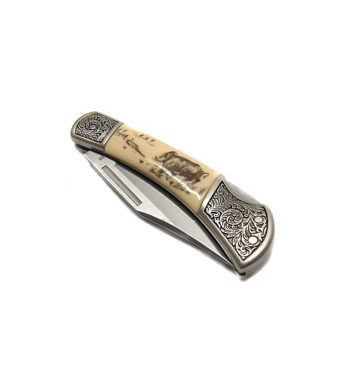 Sports Knife.KNIFE WITH BOAR PRINTED AND FALSE HORN INSERTS ON THE HANDLE, DAMASK STEEL HEAD. BLADE LENGTH: CM 8. BLADE WIDTH: CM 2. OPENED LENGTH: CM 18.5.