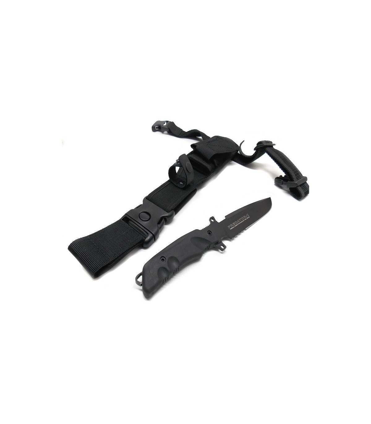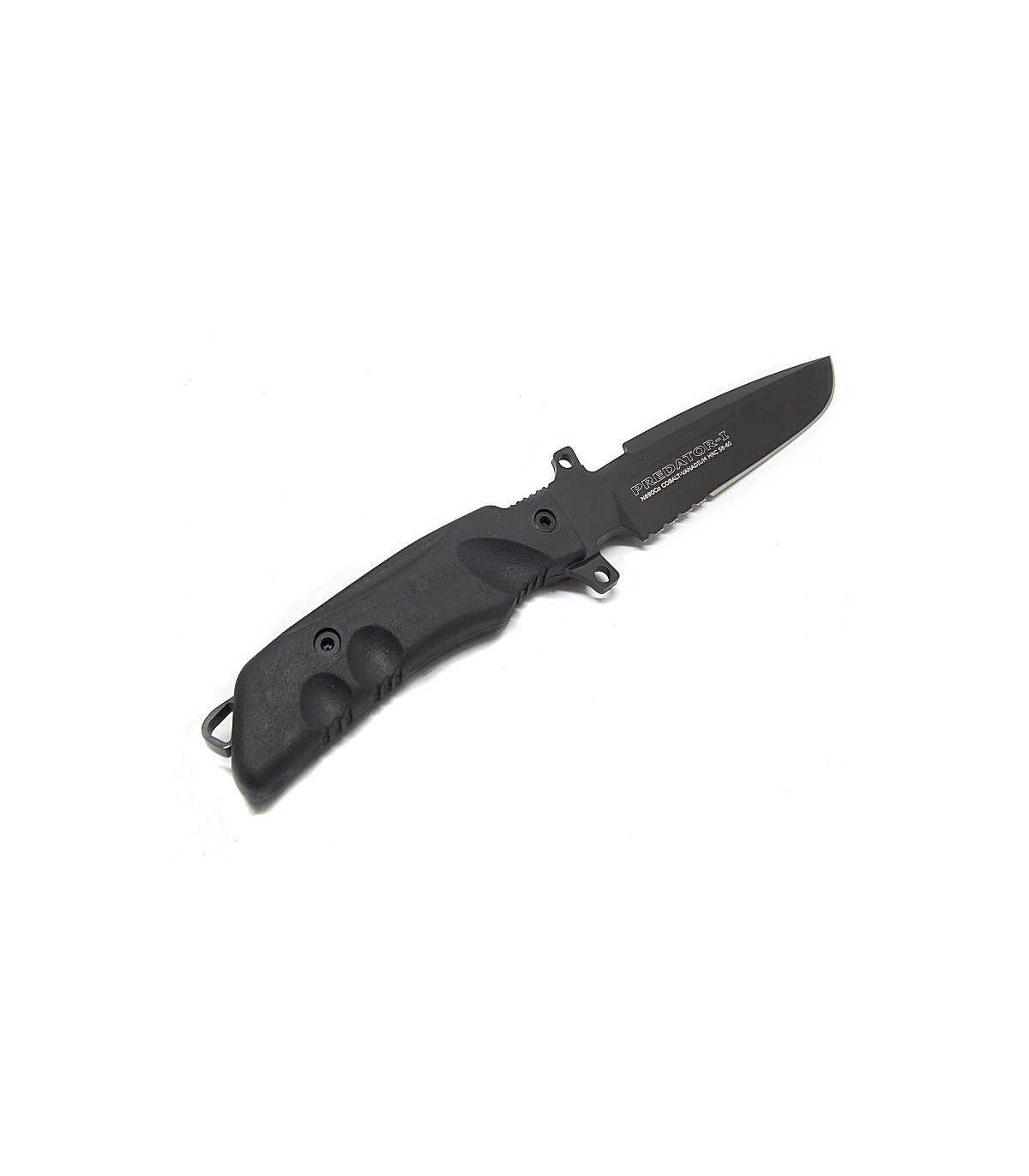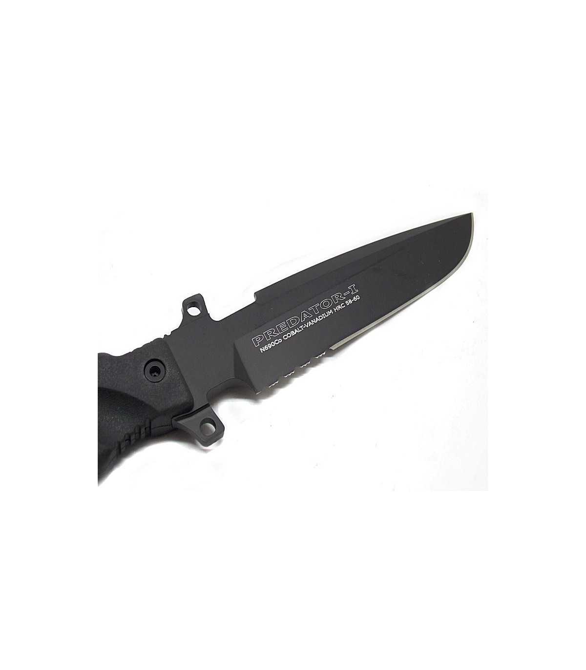 SPORTS KNIFE. PREDATOR KNIFE G3B WITH BLADE MADE OF STAINLESS STEEL COBALT VANADIUM N690 MATT BLACK TEFLON COVERED, FORPRENE HANDLE. FORPRENE IS A SPECIAL MATERIAL WITH HIGH THERMAL RESISTANCE UP TO -40° AND +150°. COMES WITH BLACK NYLON 110D MULTI-POSITION SHEATH WITH EXTENSIBLE LEG AND SAFETY LEG HOOPS. FIXED BLADE LENGTH WITH SAW: CM 15. BLADE WIDTH: CM 3.5. BLADE THICKNESS: MM 6. TOTAL LENGTH: CM 30.