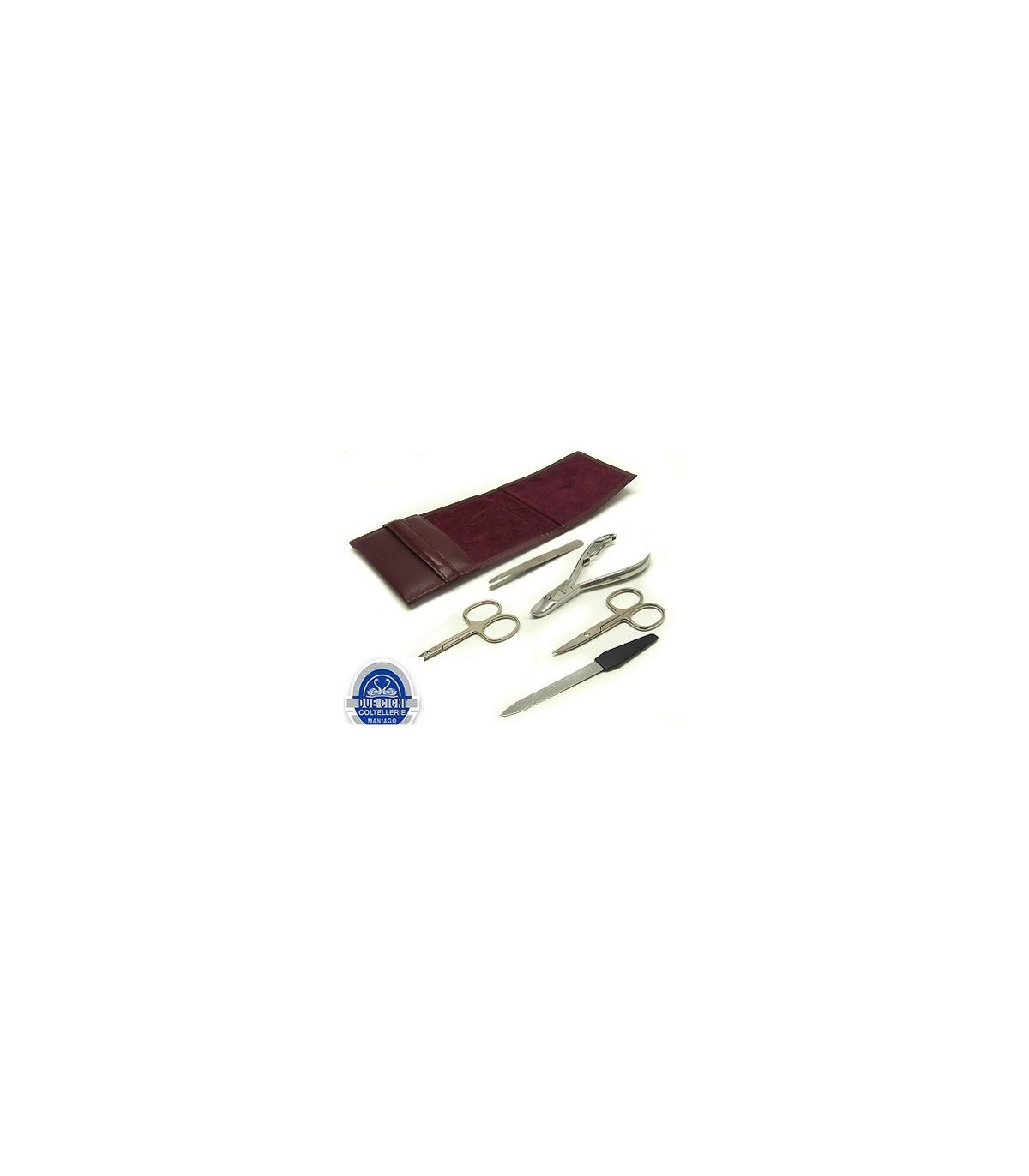 Manicure set consisting of five pieces of stainless steel: two sharp and precise cutting scissors, a tweezers, a lime and a truncate. Equipped with amaranth colored leather sheath. Great gift idea. Produced in Italy.