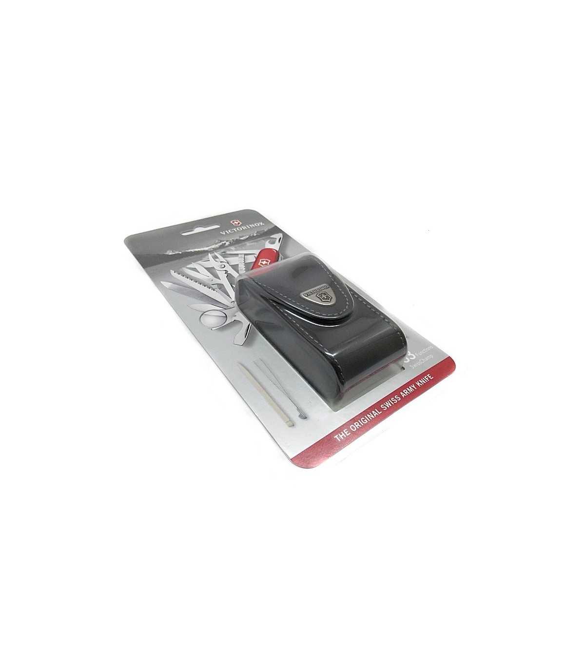Original Swiss collar with 33 functions.Large blade, small blade, corkscrew, can opener with small screwdriver (also for cross screws), bottle lifter with screwdriver and wire stripper, awl - reamer, key ring, tweezers, toothpicks, scissors, multi-purpose hook (door packages), saw for wood, fish scale with slamer and ruler (cm / inch), file for nails with metal file, nail polish and metal saw, 2.5 mm screwdriver, chisel, scraper, wire-size pliers and cable press, cross-head screwdriver, magnifying glass, ballpoint pen, pin, mini screwdriver, awl. Stainless steel blade. Red-colored cheek pads. Dimensions when closed: 9x2,8x3,3 cm. Equipped with black leather sheath with Victorinox metal logo. Made in Switzerland.