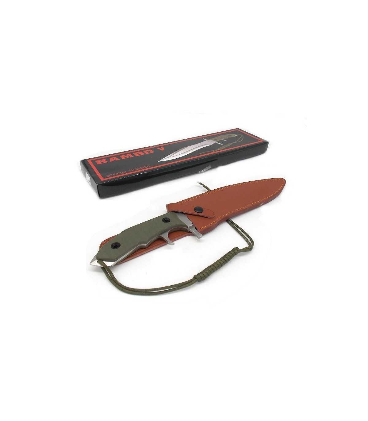 Sports knife. Blade length 21 cm, maximum blade width 4.5 cm, total length 38. Equipped with cord and brown eco-leather sheath with loop for 9 cm high belts. Green metal handle.