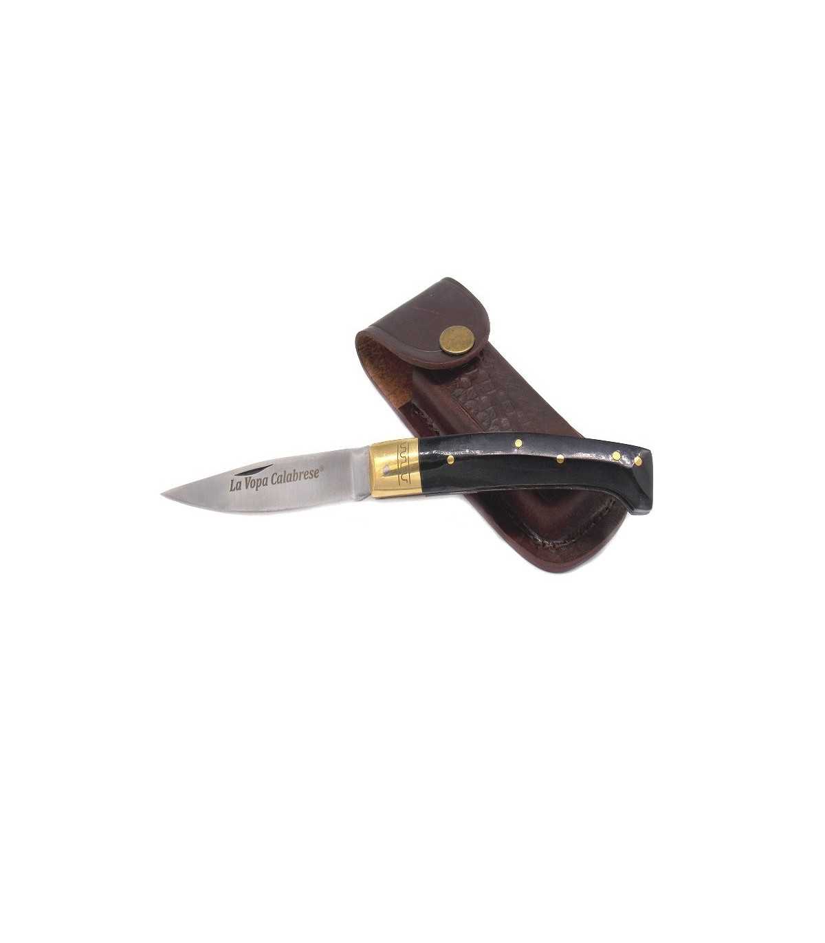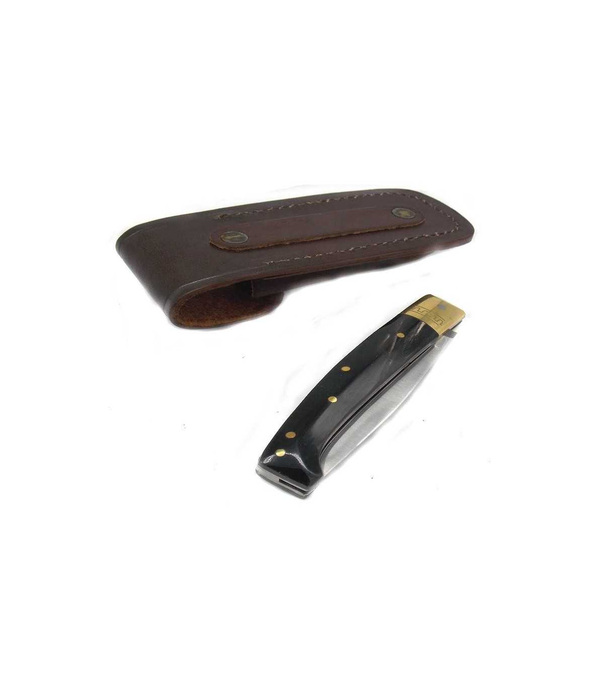 Sports knife. Blade length 8 cm, maximum blade width 1,7 cm, total open length 19 cm. Horn handle. Equipped with brown leather sheath with belt loop 6 cm high.