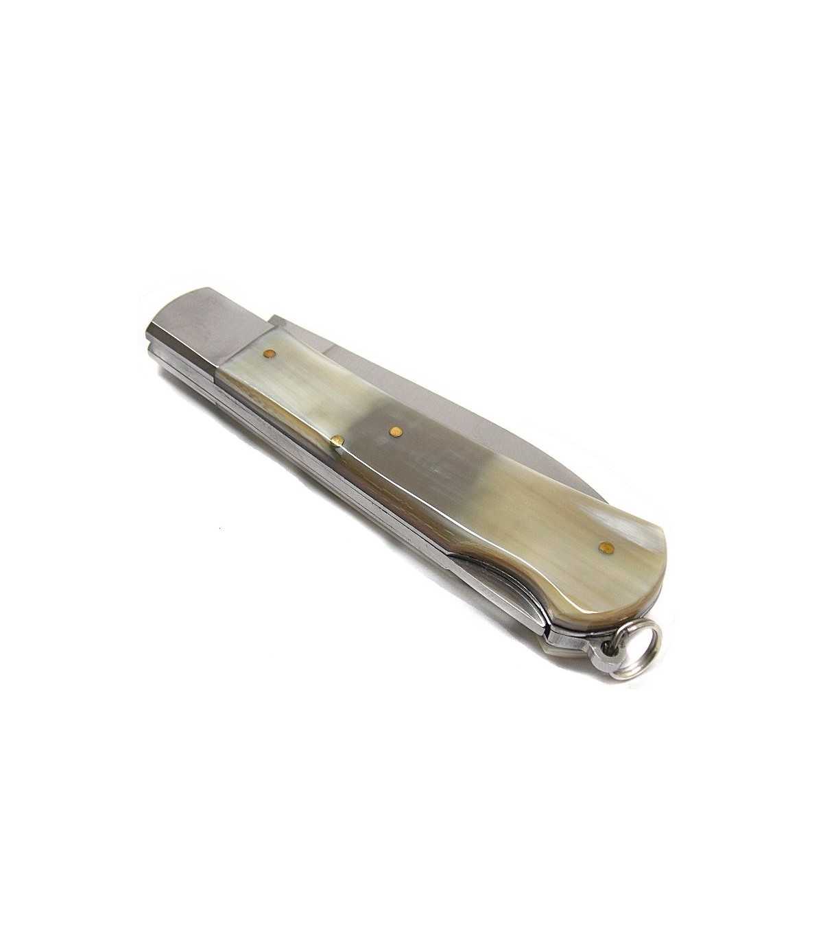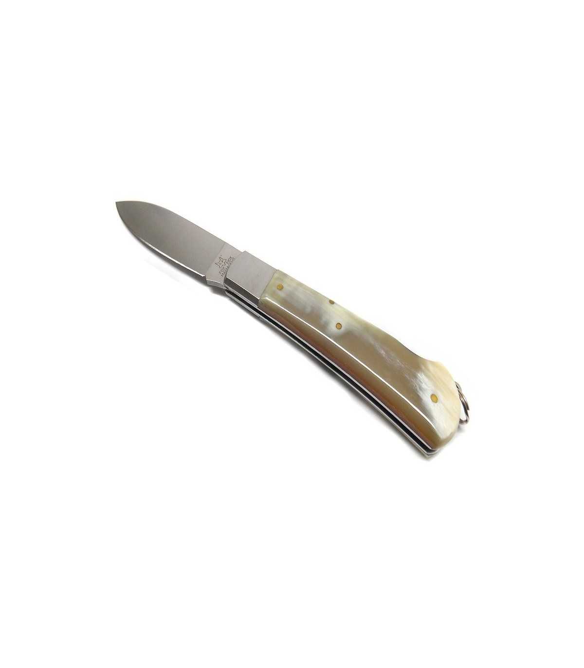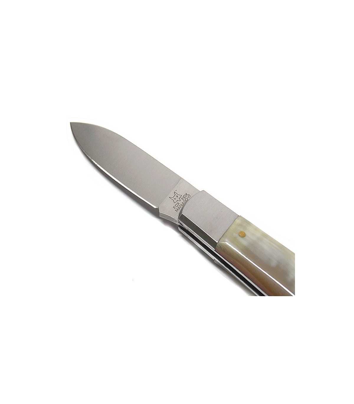 SPORTS KNIFE.FOX HUNTING KNIFE WITH HORN HANDLE, STAINLESS STEEL BLADE, BLADE LOCK, RING. BLADE LENGTH: CM 8. BLADE WIDTH: CM 2.5. TOTAL LENGTH: CM 20.5. MADE IN ITALY.