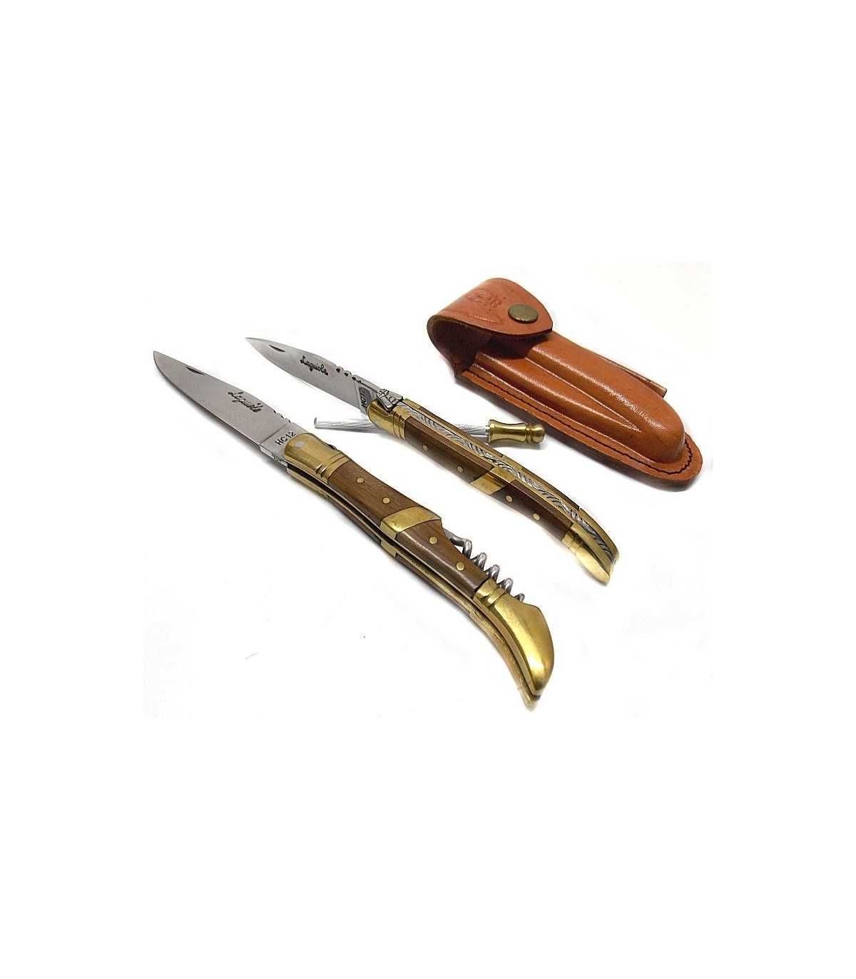 SPORTS KNIFE. LAGUIOLE 2 KNIVES AND SHARPENER. KNIFE WITH CORKSCREW DIMENSIONS: - BLADE LENGTH: CM 9. - BLADE WIDTH: CM 1.8. - TOTAL LENGTH: CM 22. THE OTHER KNIFE DIMENSIONS: - BLADE LENGTH: CM 8. - BLADE WIDTH: CM 1.5. - TOTAL LENGTH: CM 20. SHARPENER LENGTH: CM 10. COMES WITH LEATHER SHEATH WITH BELT LOOP AND CARDBOARD BOX. handle brown