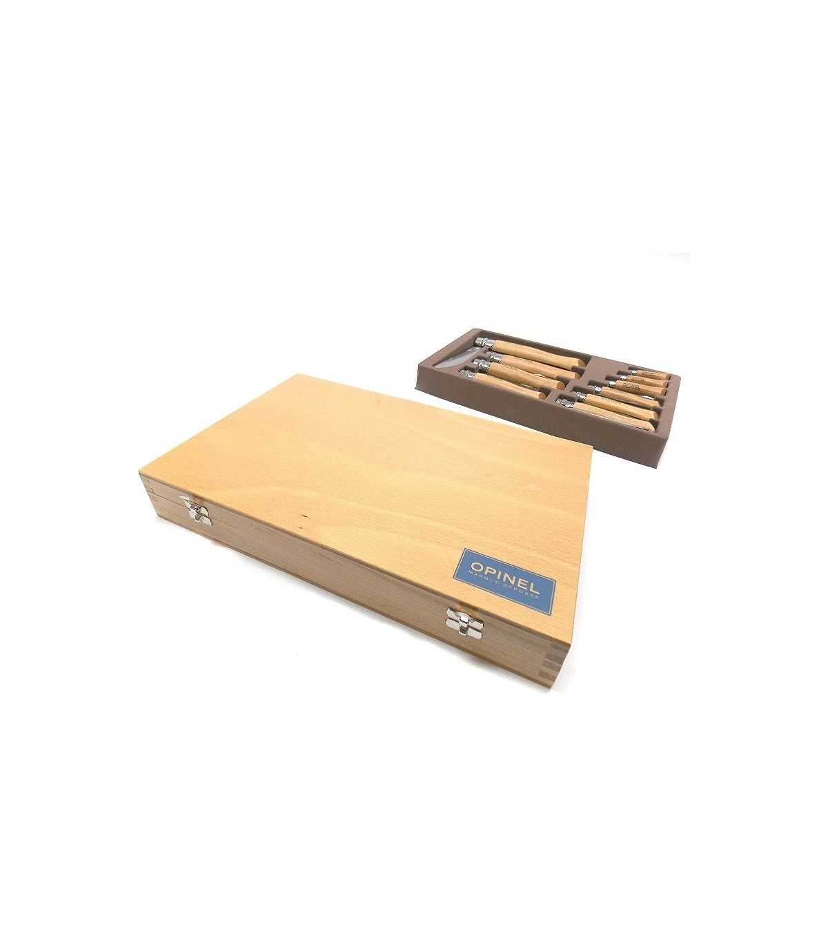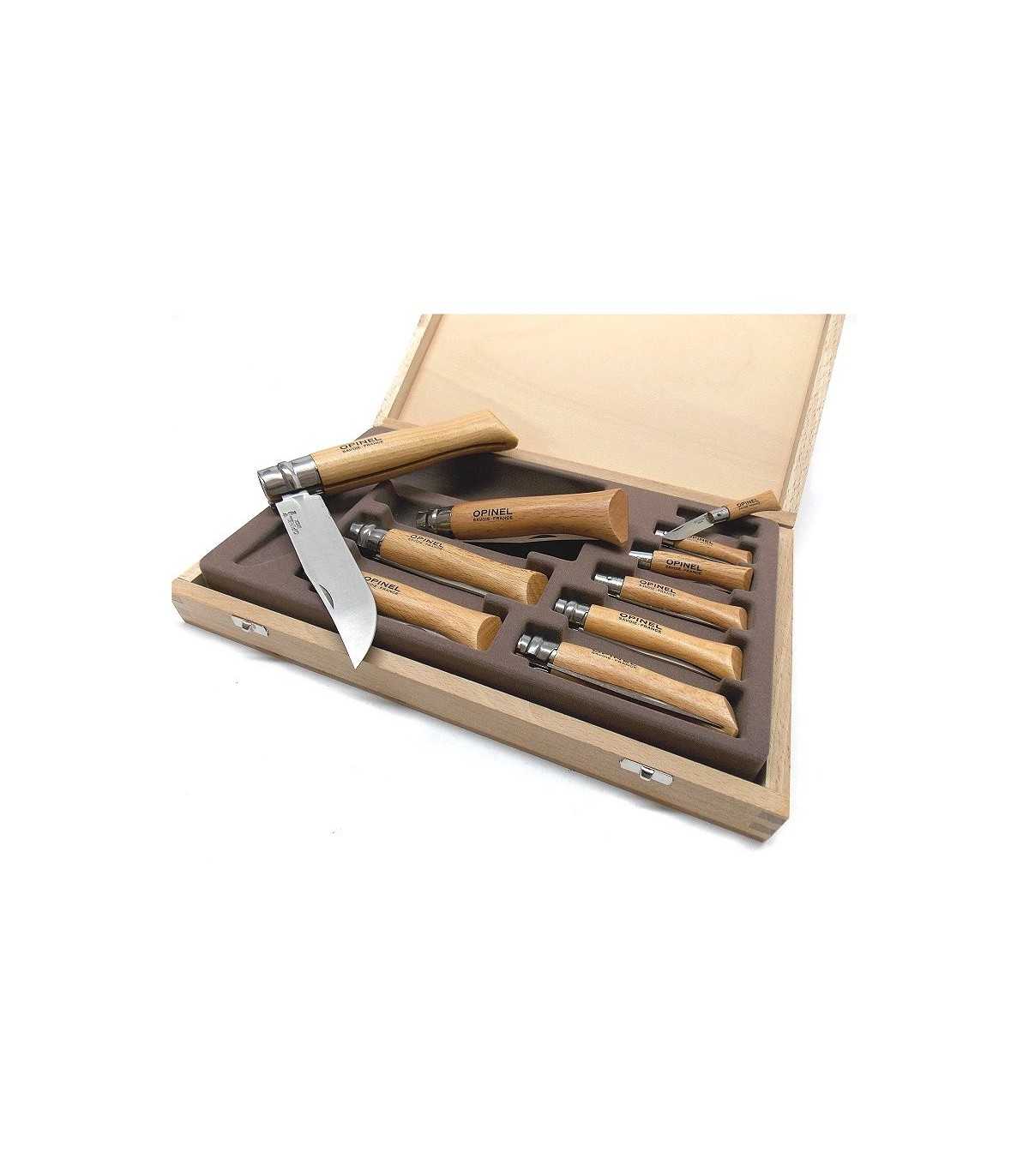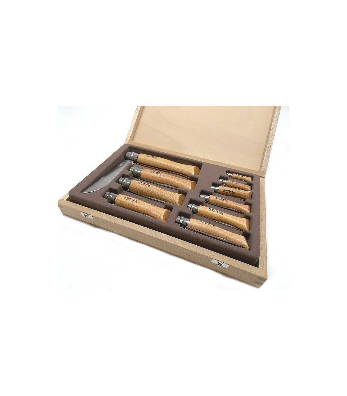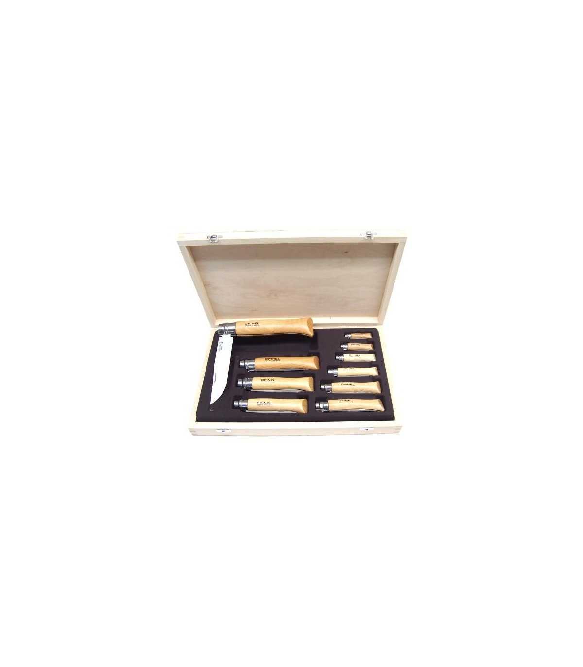 Sports Knives. OPINEL 10 KNIVES SET WITH STAINLESS STEEL BLADE, ANATOMIC WOODEN HANDLE. CASE DIMENSIONS: CM 31 x 19.5. MADE IN FRANCE. IN THE CASE THERE ARE: KNIFE N°2 - BLADE LENGTH: CM 3.5. BLADE WIDTH: CM 0.8. OPENED LENGTH: CM 8. KNIFE N°3 - BLADE LENGTH: CM 4. BLADE WIDTH: CM 1. OPENED LENGTH: CM 9.5. KNIFE N°4 - BLADE LENGTH: CM 5. BLADE WIDTH: CM 1.1. OPENED LENGTH: CM 11.5. KNIFE N°5 - BLADE LENGTH: CM 6. BLADE WIDTH: CM 1.3. OPENED LENGTH: CM 14. KNIFE N°6 - BLADE LENGTH: CM 7. BLADE WIDTH: CM 1.5. OPENED LENGTH: CM 16.5. KNIFE N°7 - BLADE LENGTH: CM 7.8. BLADE WIDTH: CM 1.6. OPENED LENGTH: CM 18. KNIFE N°8 - BLADE LENGTH: CM 8.5. BLADE WIDTH: CM 1.7. OPENED LENGTH: CM 19. KNIFE N°8 - BLADE LENGTH: CM 9. BLADE WIDTH: CM 2. OPENED LENGTH: CM 21. KNIFE N°10 - BLADE LENGTH: CM 10. BLADE WIDTH: CM 2.2. OPENED LENGTH: CM 23. KNIFE N°12 - BLADE LENGTH: CM 12. BLADE WIDTH: CM 2.5. OPENED LENGTH: CM 28. Produced in France.