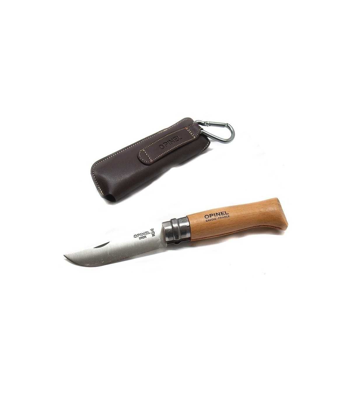 Folding sports knife with stainless steel blade. Handle in light weathered wood with a slightly anatomic shape. Blade length 8 cm, total length open 19.5 cm, blade width 1.8 cm. Equipped with brown leather sheath with belt loops 5 cm high and with carabiner. Produced in France.