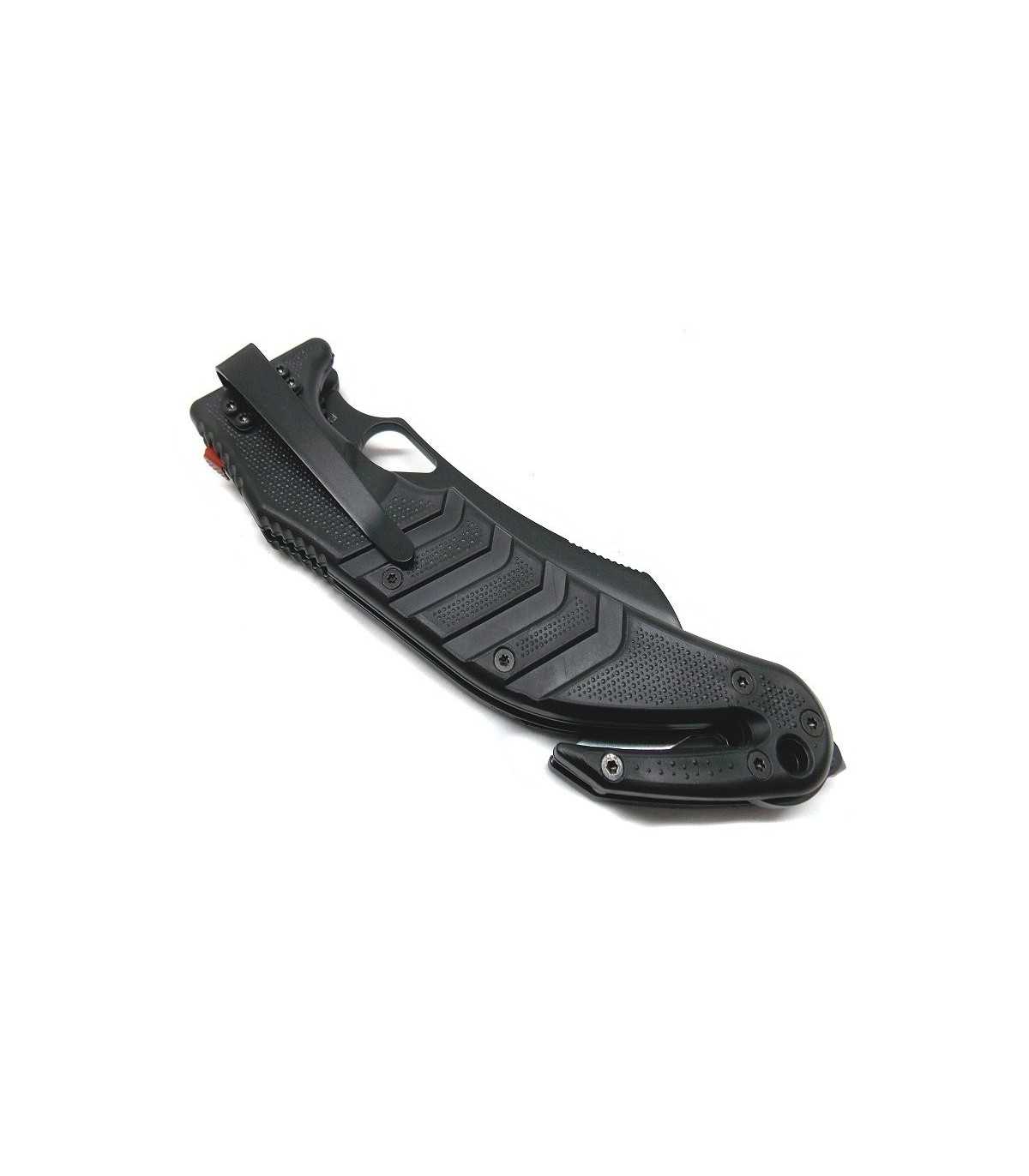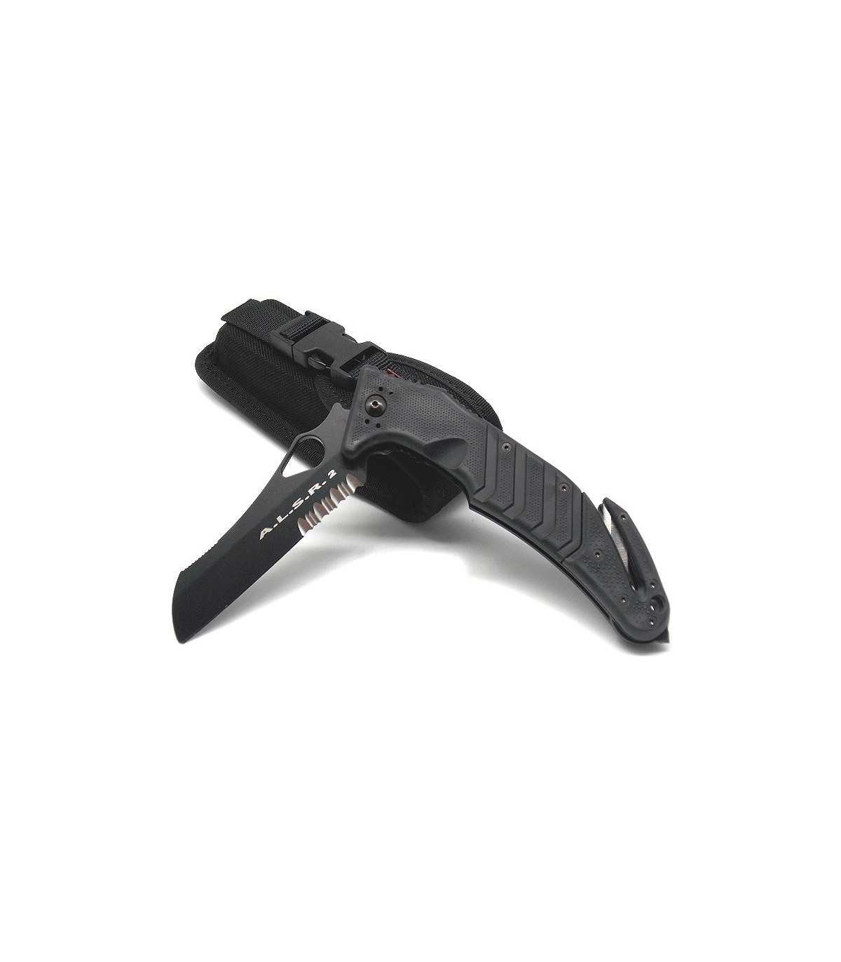 SPORTS KNIFE.FOX ALSR2 FOLDING KNIFE WITH BLACK FORPRENE HANDLE, BLACK OBLIQUE TIP BLADE MADE OF COBALT VANADIUM N690CO STAINLESS STEEL, BELT CUTTER. IDEAL FOR AIR, LAND, SEA SAFETY. BLADE LENGTH: CM 8.5. BLADE WIDTH: CM 2.5. OPENED LENGTH: CM 24. MADE IN ITALY.