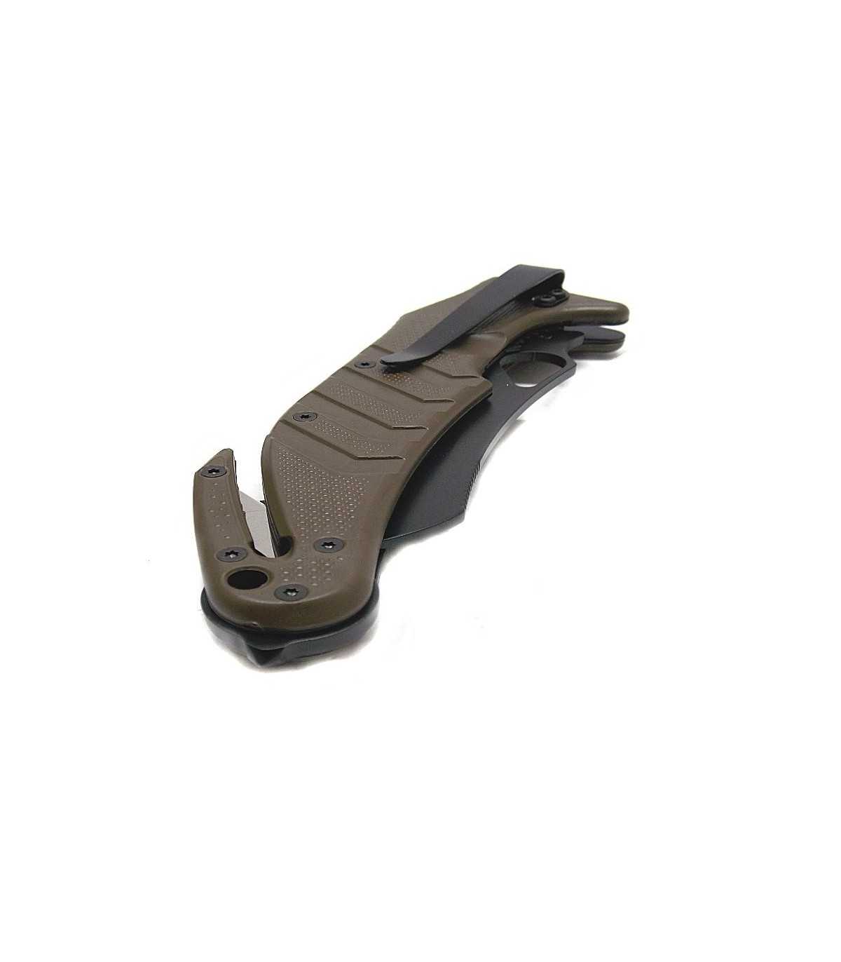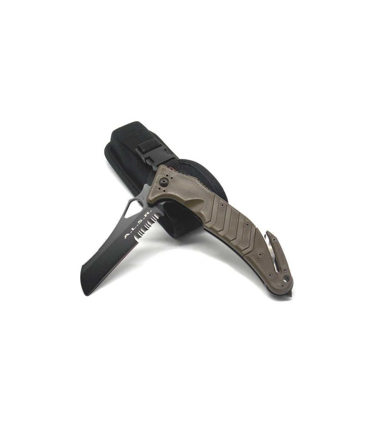 SPORTS KNIFE.FOX ALSR2 FOLDING KNIFE WITH BROWN FORPRENE HANDLE, BLACK OBLIQUE TIP BLADE MADE OF COBALT VANADIUM N690CO STAINLESS STEEL, BELT CUTTER, BELT CLIP. IDEAL FOR AIR, LAND, SEA SAFETY. COMES WITH SHEATH. BLADE LENGTH: CM 9. BLADE WIDTH: CM 2.5. OPENED LENGTH: CM 24. MADE IN ITALY.