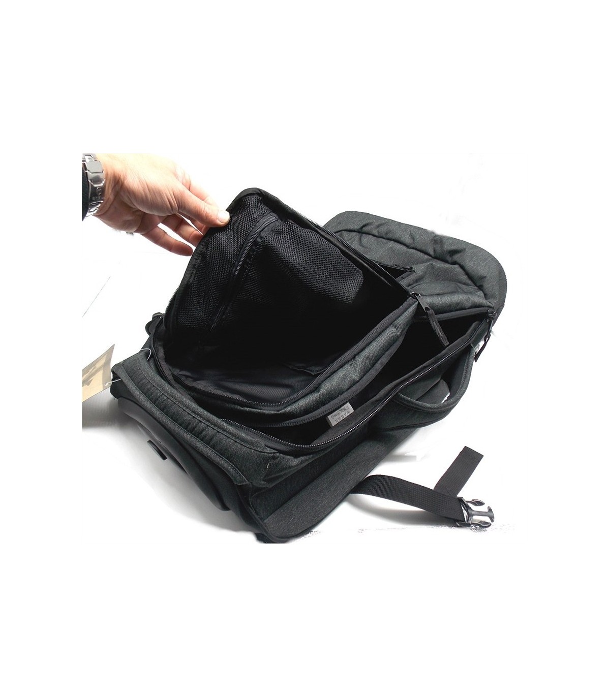 Comparto frontale con due tasche interne: una in tessuto ed una tasca in rete di sicurezza con porta chiavi