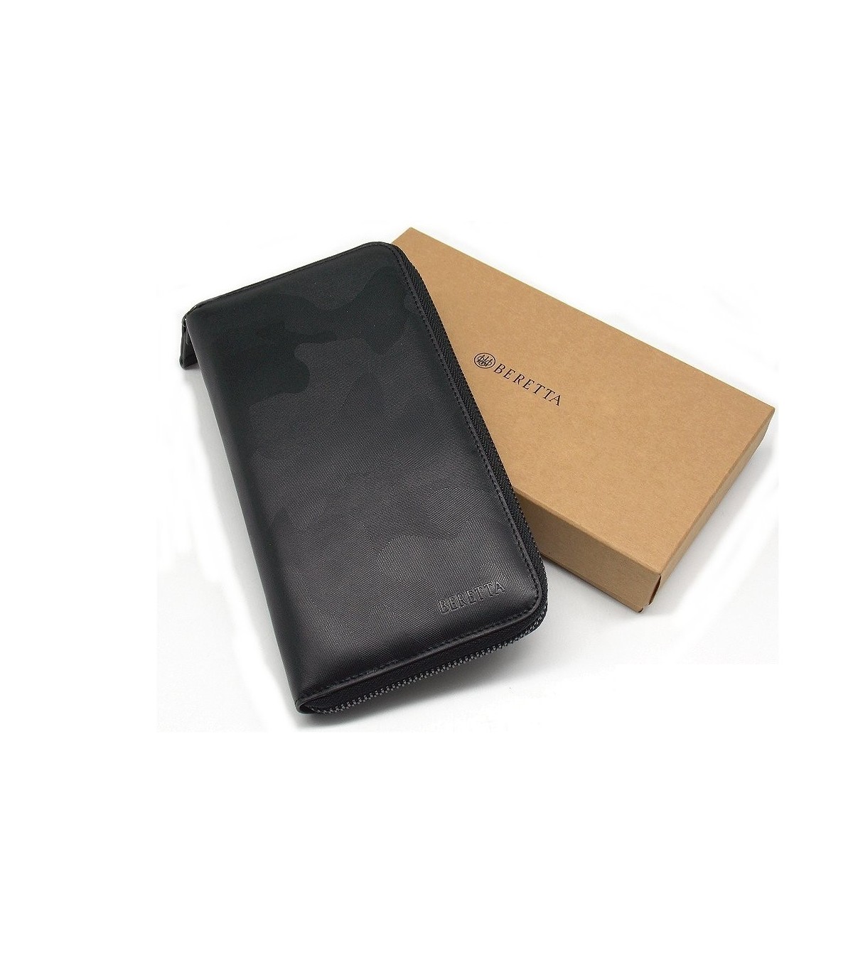 Interno: Undici scomparti per carte di credito, due scomparti per documenti e uno scomparto per documenti con zip Esterno: Chiusura con zip e logo Beretta impresso