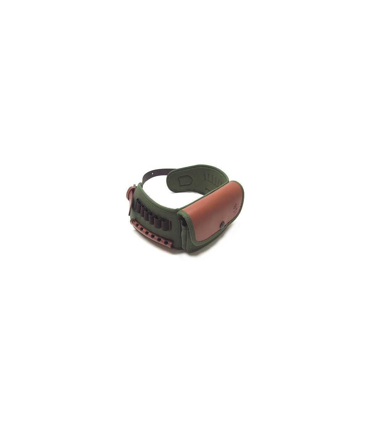 CARABINE GREEN CORDURA AND LEATHER CARTRIDGE BELT WITH FOURTEEN ELASTIC LOOPS, LEATHER PROTECTIVE BALL, CENTRAL POCKET WITH SNAP, LEATHER COVERED FLAP>br>MAXIMUM LENGTH CM 94>br>MADE IN ITALY.