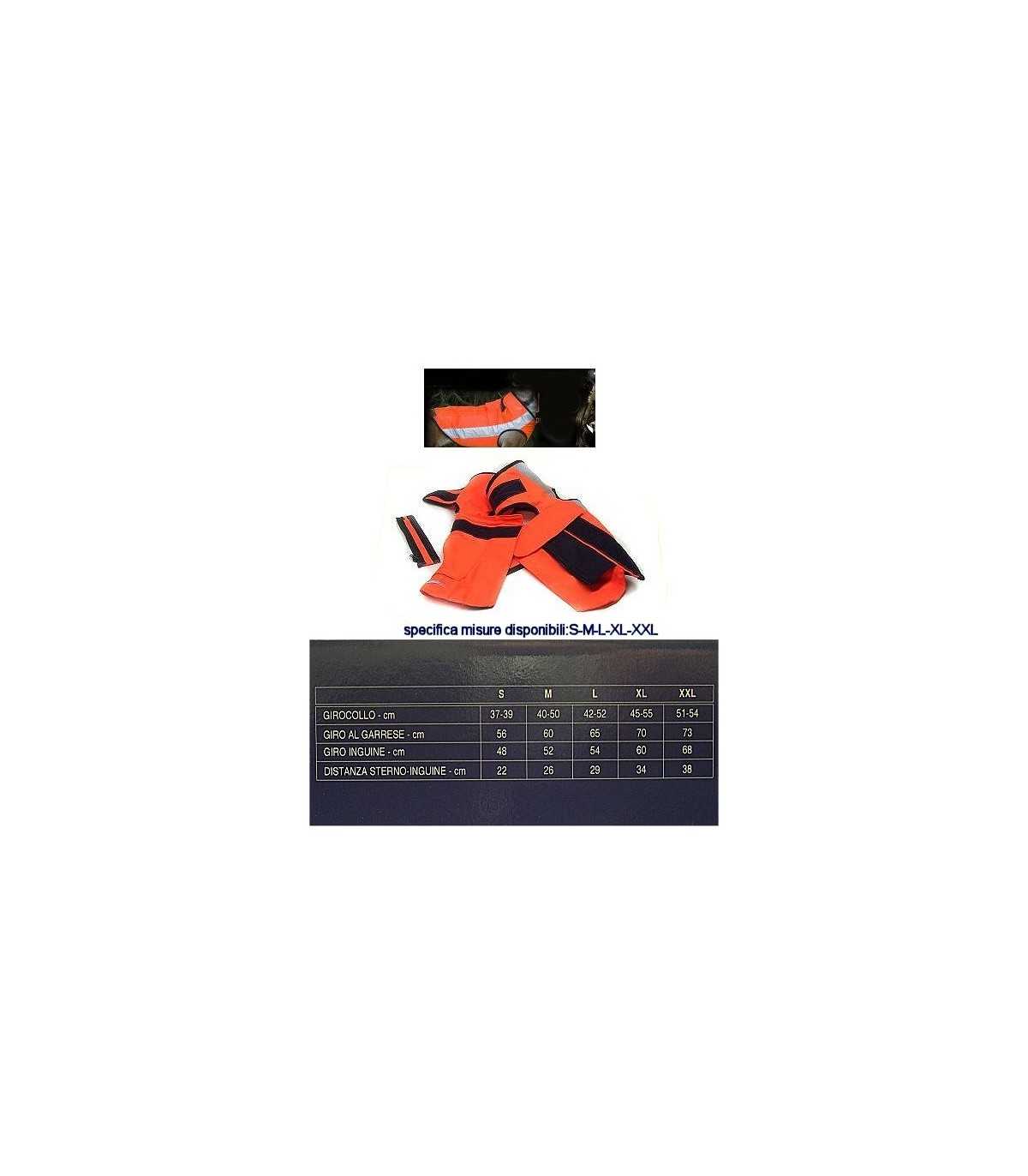 DOG CHEST PROTECTOR FOR BOAR HUNTING>br>BOAR TOOTH SIMULATION UP TO 45 JOULES>br>NO DRILLING>br>NIJ 0101.04>br>MADE OF VERY RESISTANT AND HIGH QUALITY MATERIALS: 65% POLYESTER, 35% COTTON>br>IT PROTECTS CAROTID ARTERIES AND VITAL PARTS (HEART, THROAT, LUNGS)>br>COLOUR: HIGH VISIBILITY ORANGE>br>HIGH VISIBILITY REFLECTOR INSERT>br>ZIP CLOSURE AND STRAP>br>SIZE: S, M, L, XL.