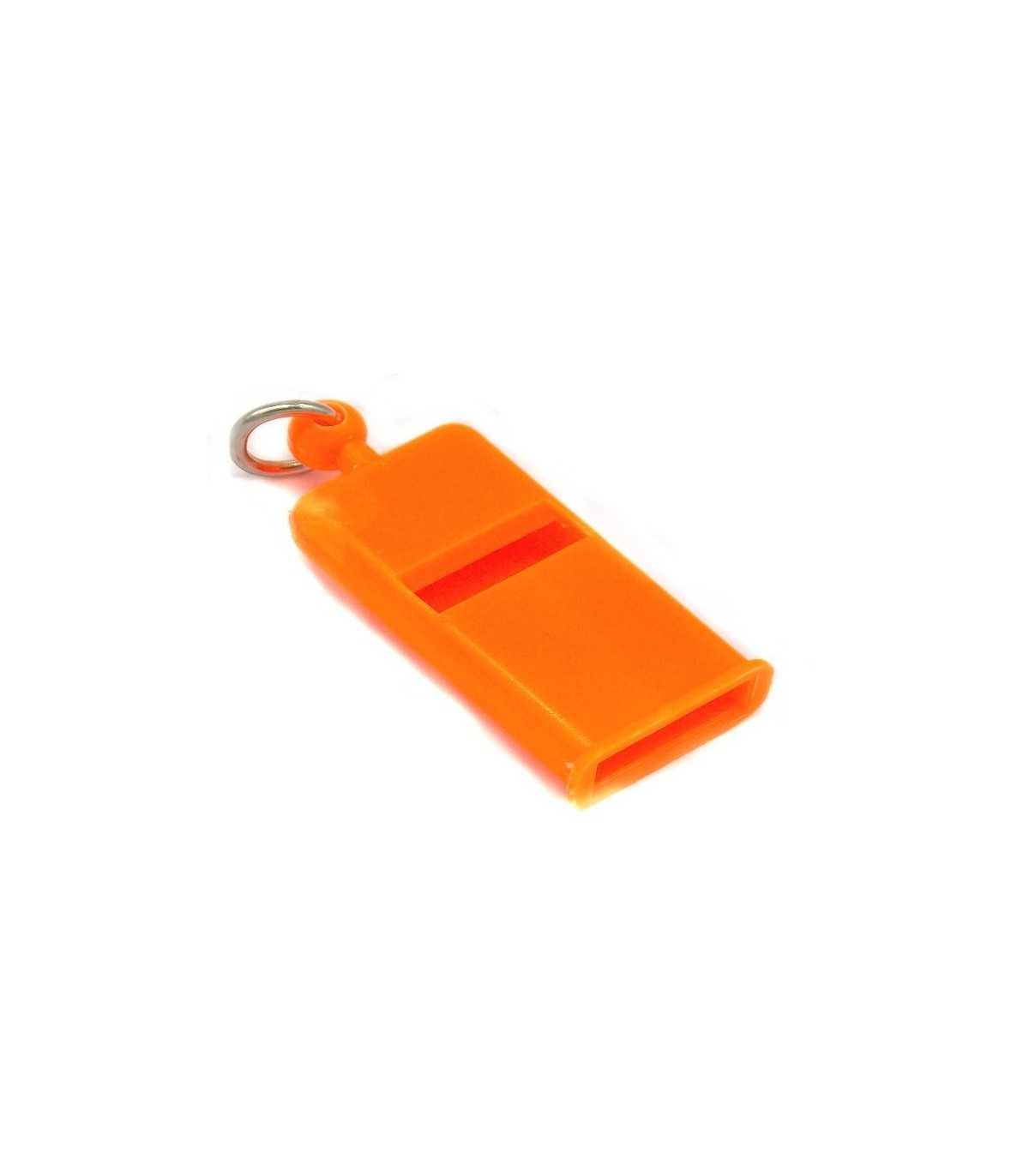Plastic whistle for dog training, fluorescent orange color>br>Length 4 cm, width 1.6 cm>br>With metal ring.