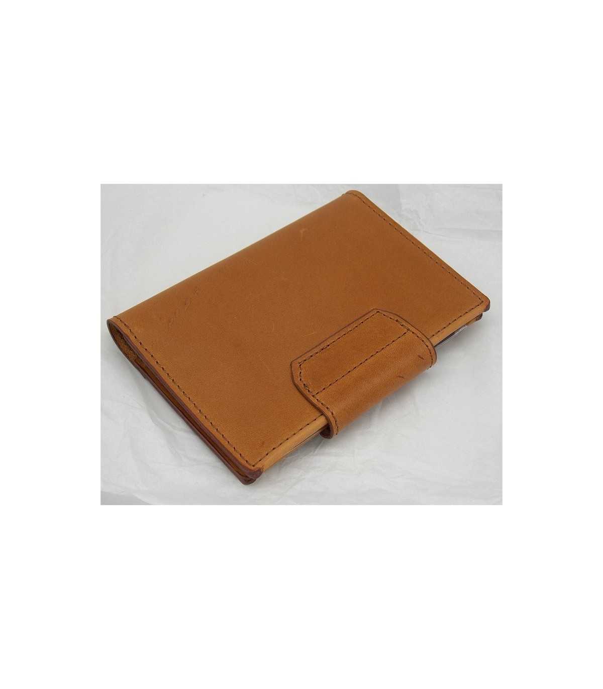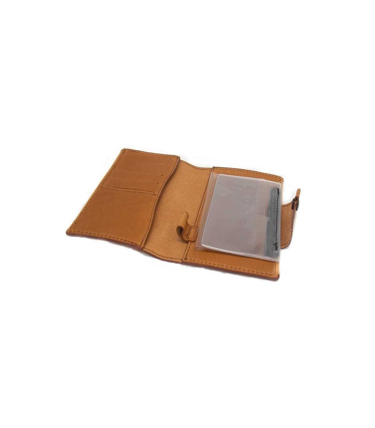 Brown leather document holder with button closure>br>With 7 transparent windows, with two pockets and pen hook>br>Closed dimensions: 10x15 cm>br>Produced in Italy.