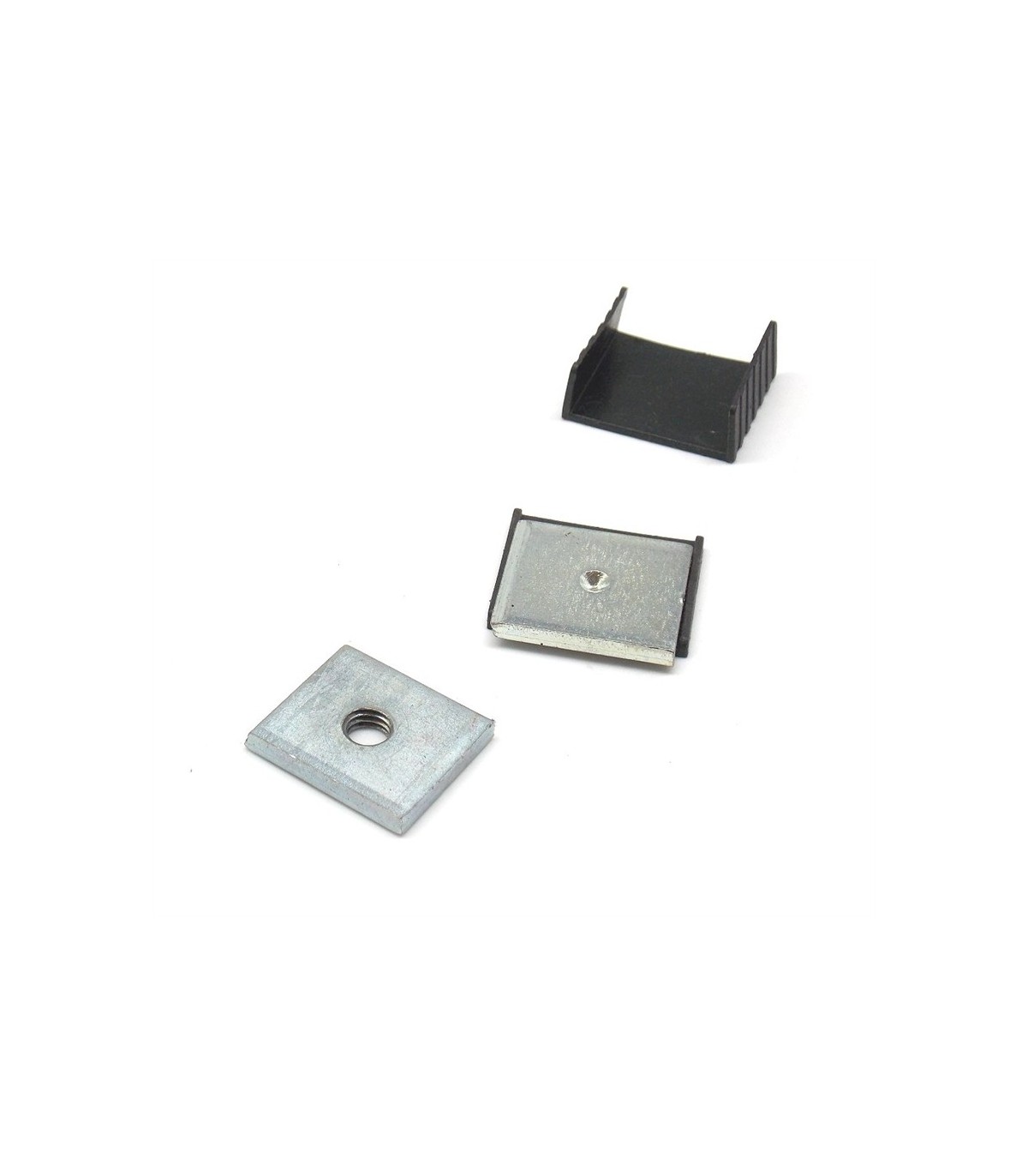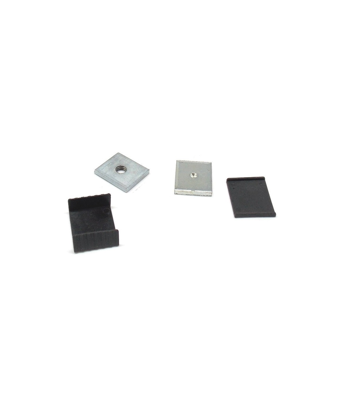 Il Kit è formato da 4 pezzi: due piastrine in nylon nero, una piastrina in acciaio con il foro di centraggio, una piastrina in acciaio con il foro filettato.