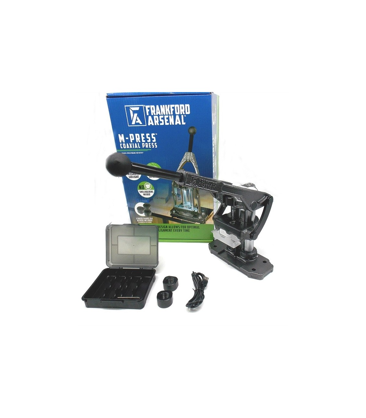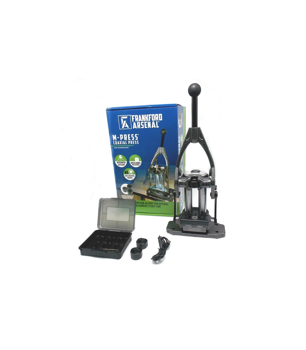 Pressa dotata di shell holder universale, di tre boccole per la sostituzione dei dies, di illuminazione a led e cavetto usb