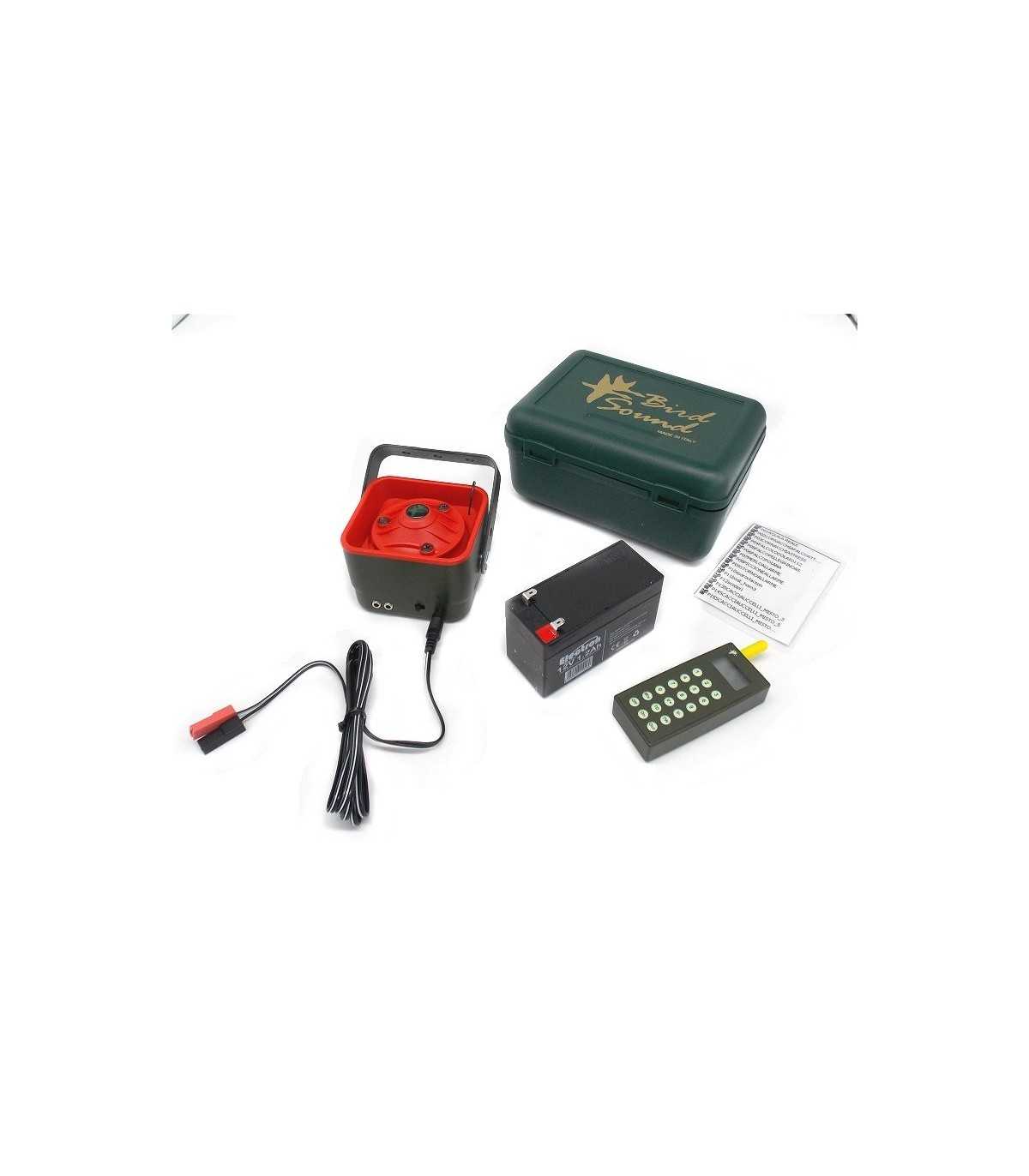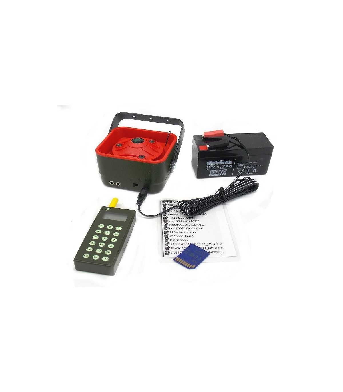 POWER: 30 WATT>br>COMES WITH SD CARD, TIMER , RECHARGEABLE BATTERY, CABLE, REMOTE CONTROL, PLASTIC CASE>br>DIMENSIONS: 59 X 80 X 88 MM>br>WEIGHT: GR 435>br>TENSION SUPPLY 12 VOLTS>br>SOUNDS AND SONGS IN SUCCESSION IN RANDOM ORDER NOT TO GIVE WAY TO DANGEROUS TO GET USED TO THE SOUND REPETITIVE>br>IT IS EFFECTIVE OVER AN AREA OF 1000 MQ>br>List of the sounds present in the hunting birds: 1-eagle royal, 2-crow-hawk, 3-crow stress, 4- hawk lodolaio, 5- falcon peregrine, 6- hawk poana, 7-merlo alarm, 8- pigeon alarm, 9- flock alarm, 10- firing horn, 11- boat, 12- blowouts, 13- mixed race3, 14- mixed race6, soft mixed race.