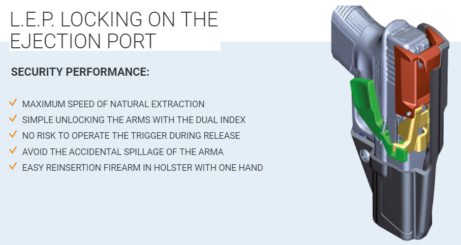 The first is the patented L.E.P – Locking on the Ejection port Automatic Safety System located on the side and ergonomically confifigured to facilitate a quick and natural draw as well as reholstering and locking, ensuring high safety performance and efficiency.