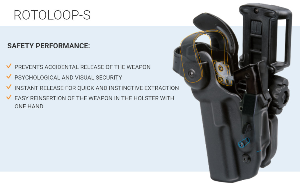The second is the Rotoloop-S system, an external weapon protection strap with automatic opening by means of a pressactivated rotating mechanism.