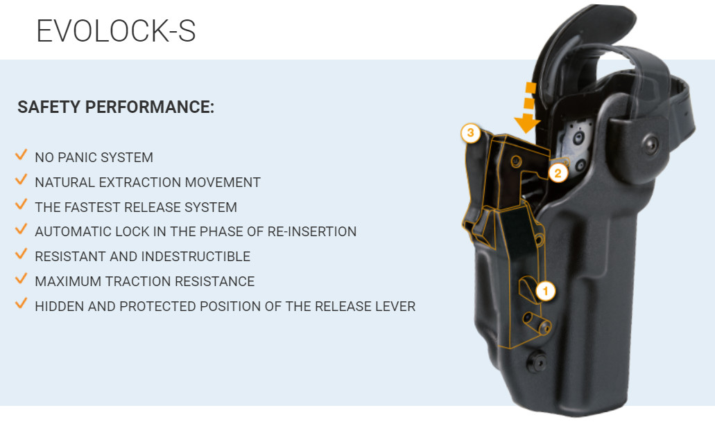 The first is the automatic safety system Evolock-S Evolution Locking System, an internal locking mechanism activated by the weight of the weapon, quick-release and simple.