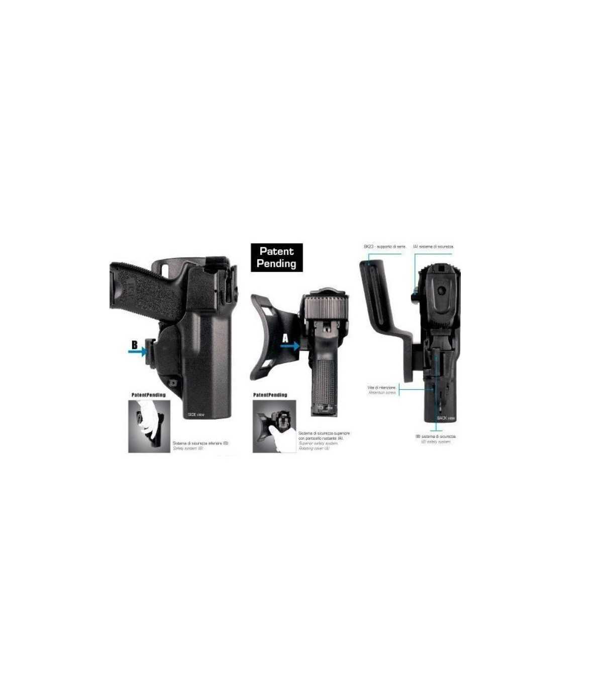 The double safety mechanism gives to the operator the possibility of to putting the firearm in maximum safety, useful during dangerous situations like riots, revolts, sport events and, with the opportunity to remove the superior safety system A and to have always the security system of the trigger guard locked.