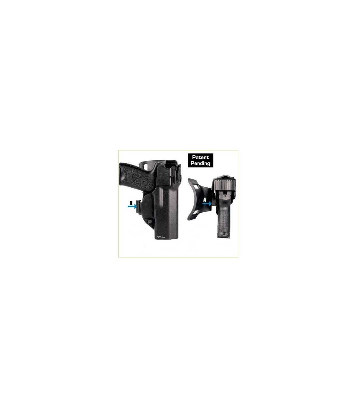 Holster suitable for uniform or tactical professionals uses, made in special injection molded polymer.