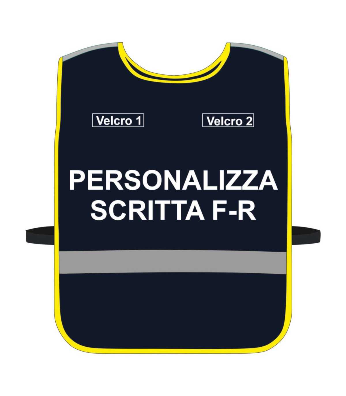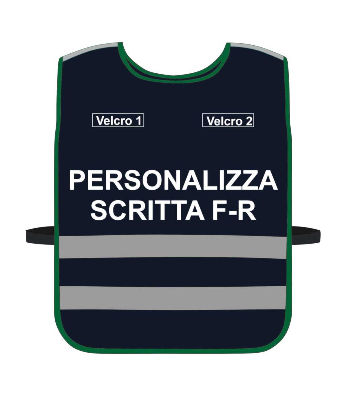 Prodotto confezionato in Italia personalizzabile su tutti i fronti: dal colore di fondo, ai bordini laterali, alle bande rifrangenti, alla stampa, al colore della stampa, ai velcri da applicare (forma e dimensione).