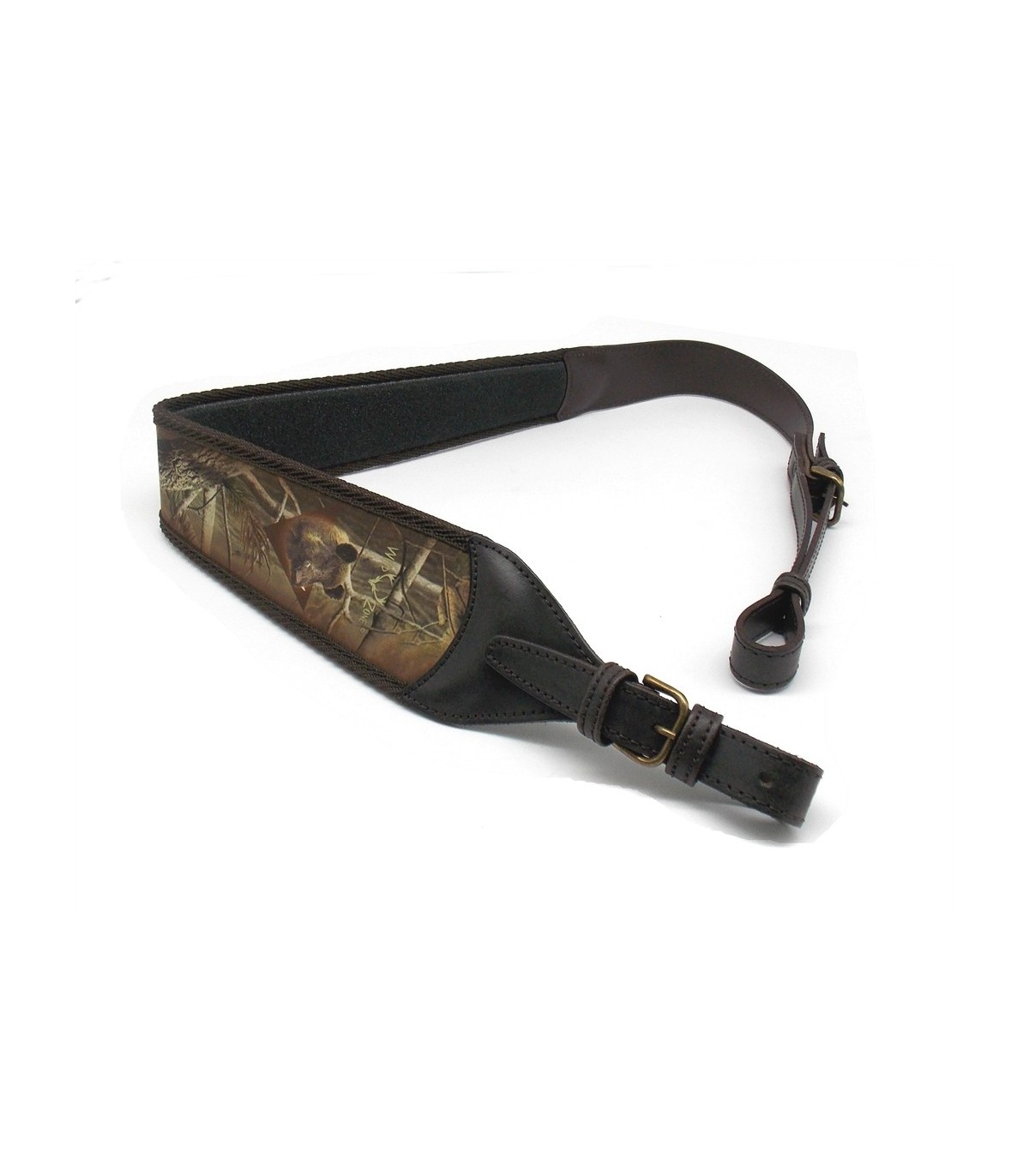 Bretella per carabina in cuoio marrone e neoprene marrone con stampa cinghiale