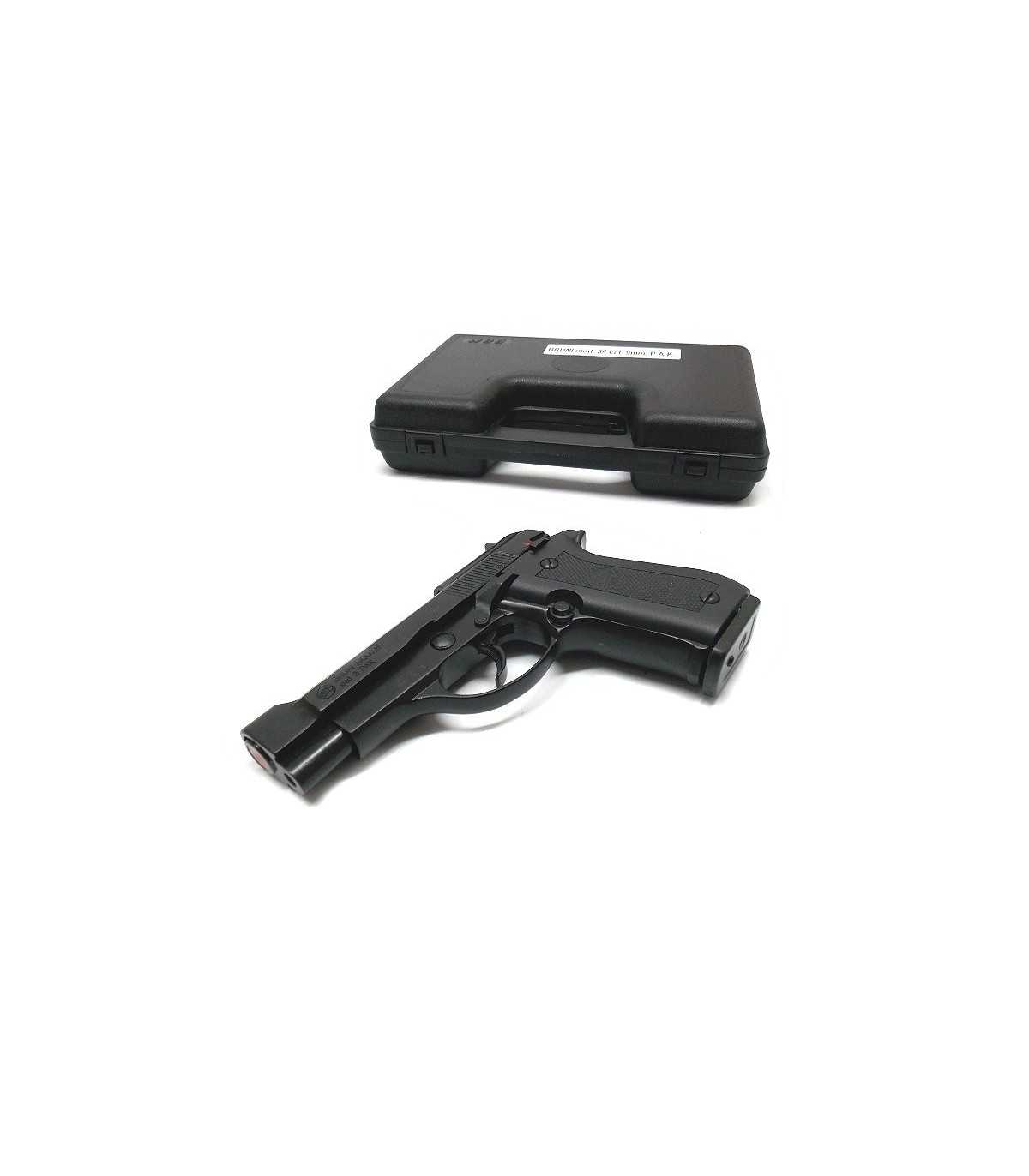 Pistola in lega di zinco, peso 860 g, lunghezza 17 cm da punta canna a punta calcio in linea retta, altezza massima 12,5 cm
