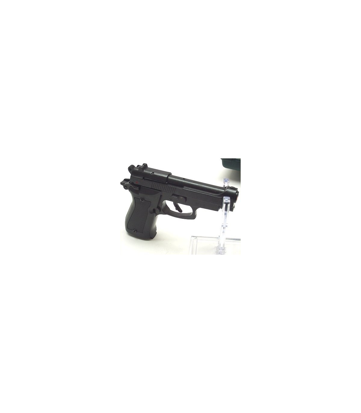 Strumento dissuasore a segnalazione acustica riproducente pistola, singola e doppia azione, sicura, caricatore con otto colpi, leva arresto carrello, smontabile per la pulizia