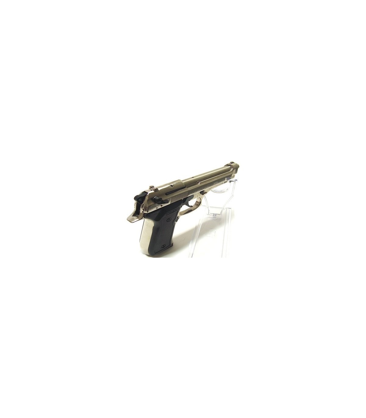 Strumento dissuasore a segnalazione acustica riproducente pistola, singola e doppia azione, sicura, 16 colpi, leva arresto carrello, smontabile per l a pulizia