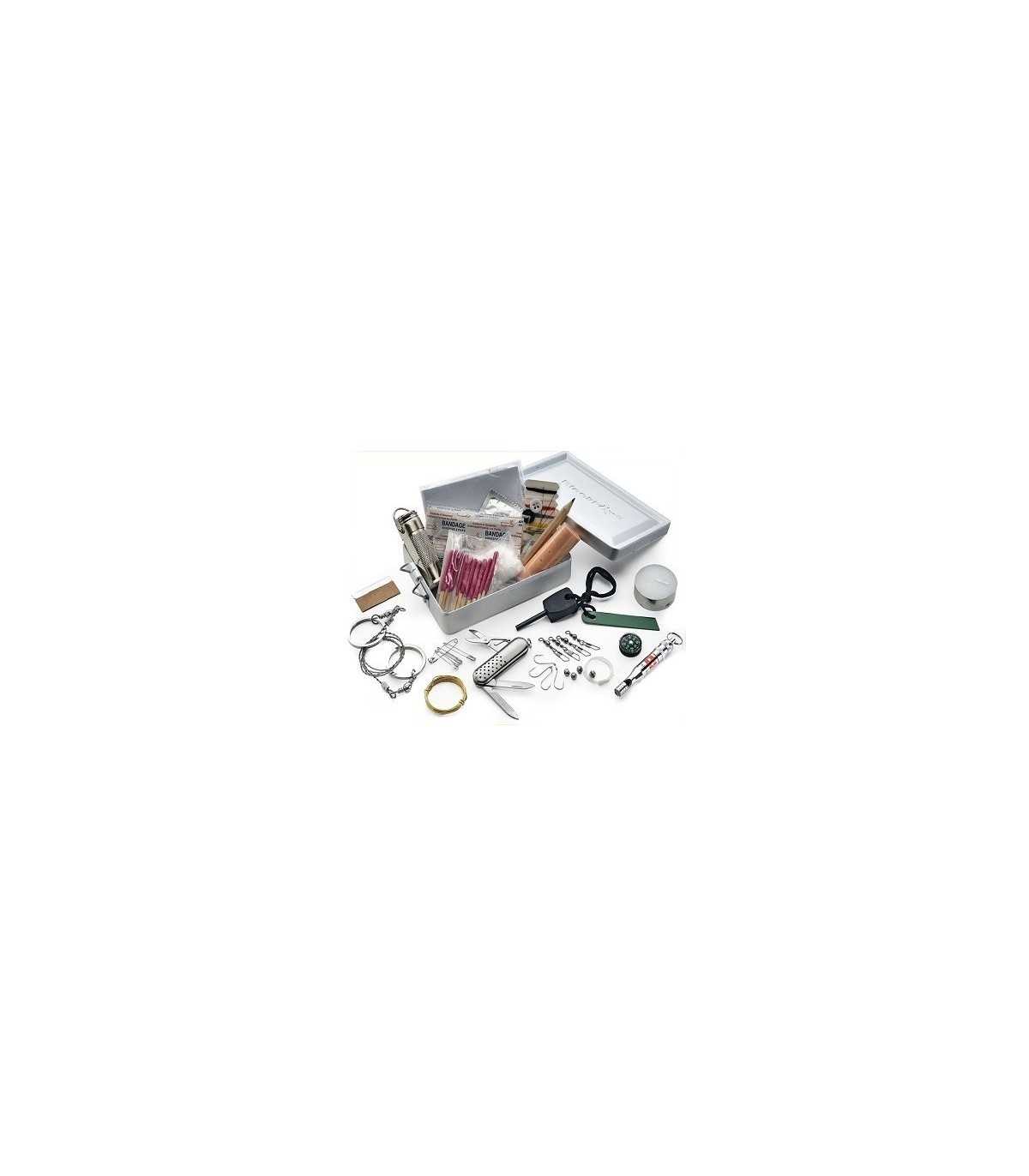 Il kit è contenuto in una scatola di alluminio impermeabile e comprende un mini acciarino, cotone, matita, fischietto in metallo di emergenza, profilattico, fiammiferi antivento, un piccolo coltello multiuso, una candela, spille da balia, ami da pesca, bussola e carta per scrittura, sega a cavo, , benda ed inoltre una candela speciale della Cyalume della durata di 8 ore