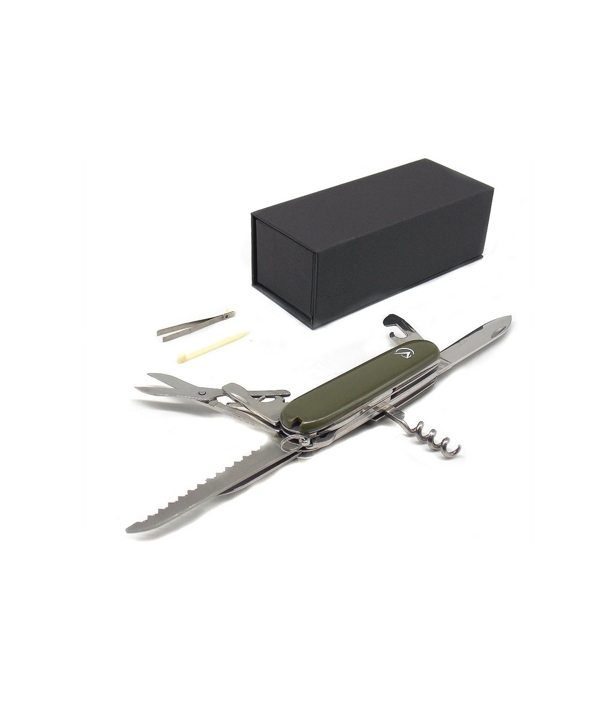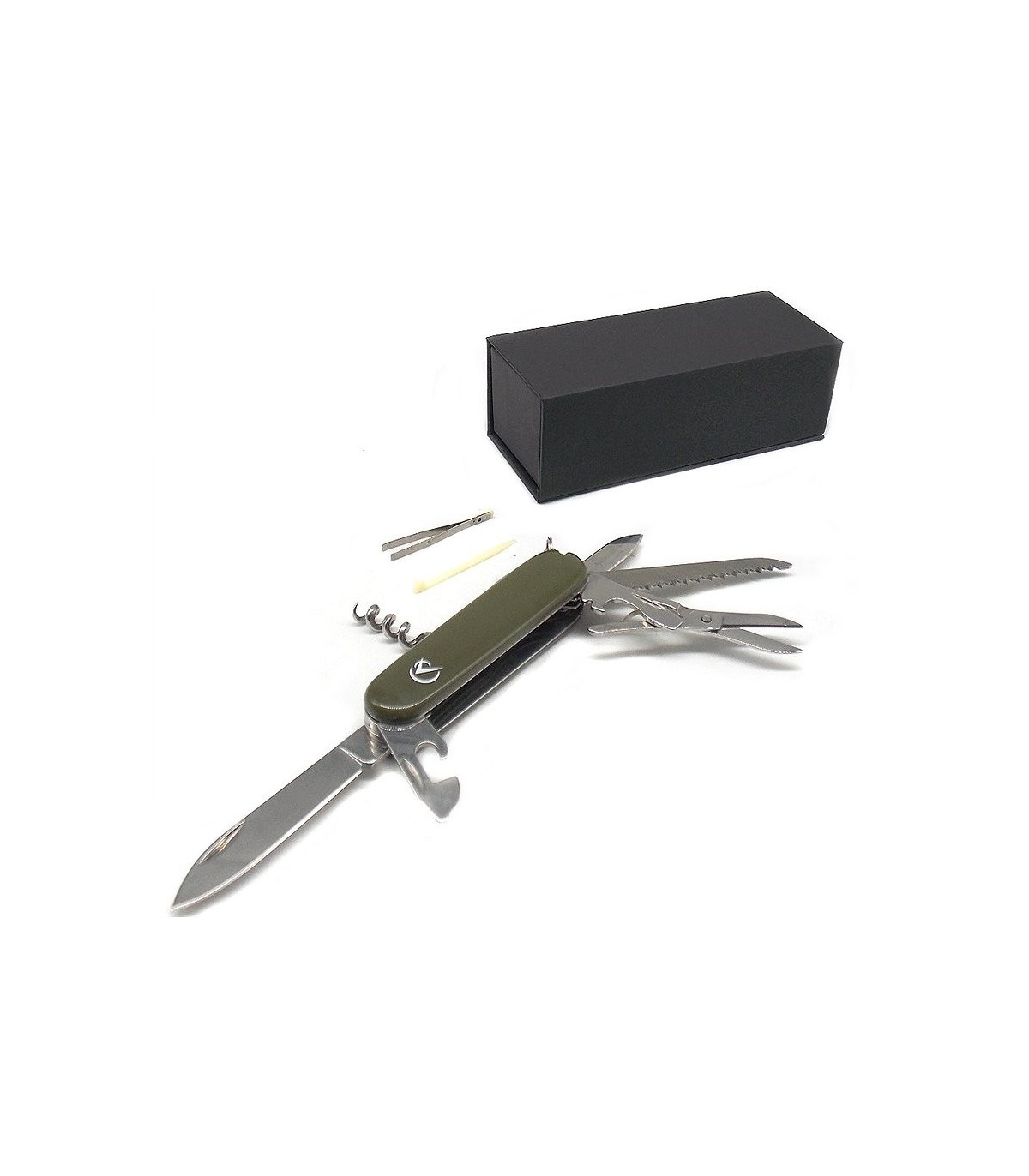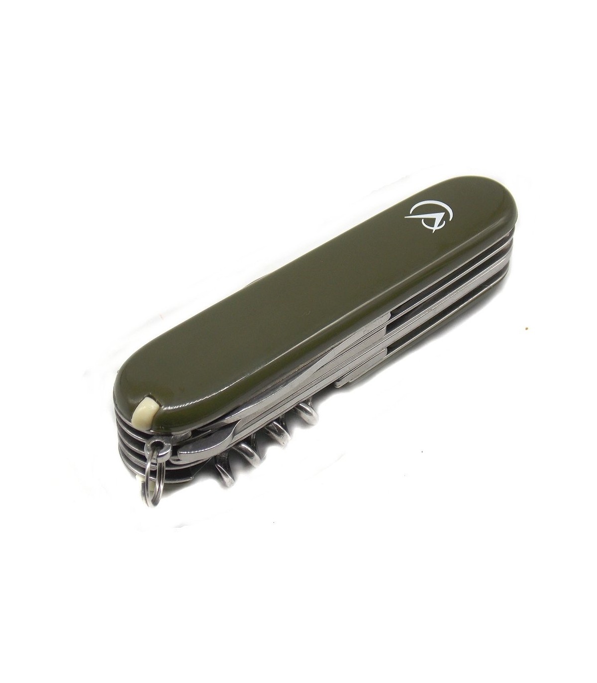 Contiene: stuzzicadenti, lama grande e lama piccola, cavatappi, pinzetta, forbici, seghetto, apribottiglie, punteruolo, anellino, uncino, limetta