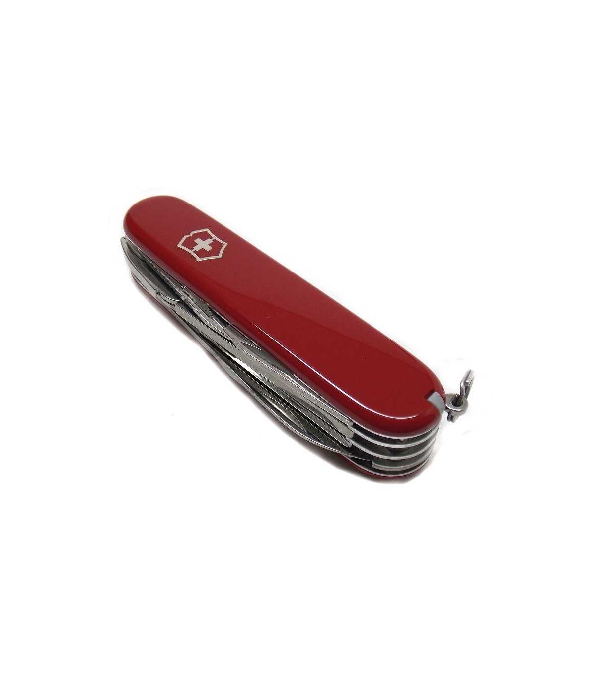 Dotato di: lama grande, lama piccola, cavatappi a croce, apriscatole con - cacciavite piccolo, levacapsule con - cacciavite-spelafili, punteruolo, anello portachiavi, pinzetta, stuzzicadenti, forbici, gancio multiuso, pinze con taglia fili
