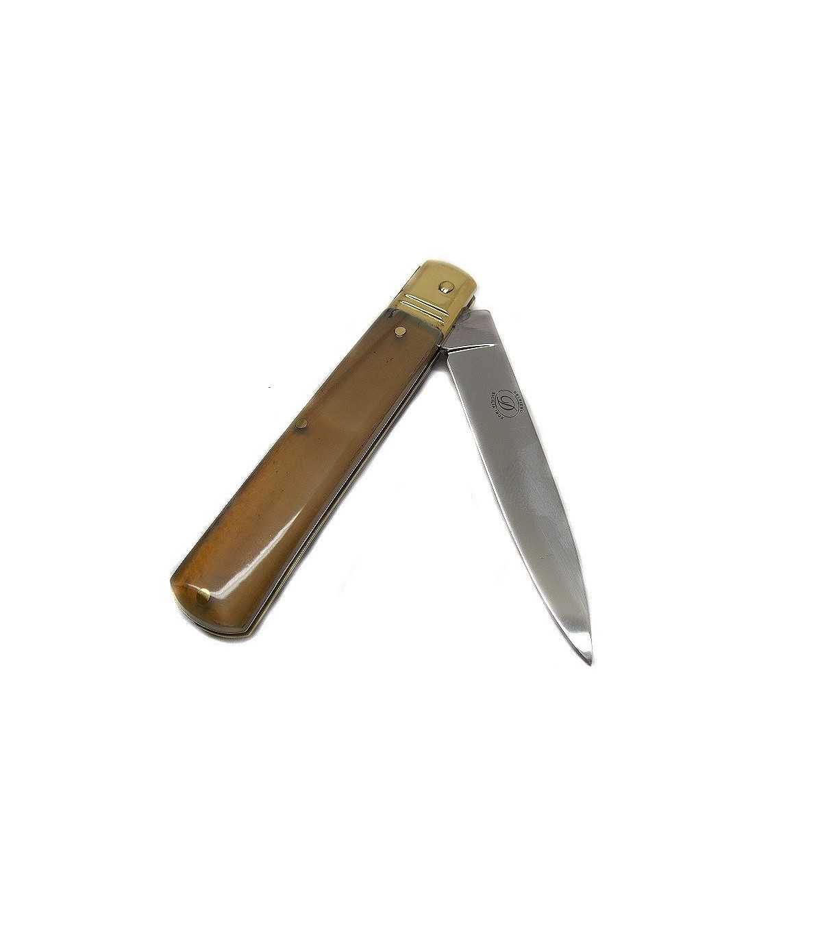 Questo particolare coltello presenta una doppia caratteristica che lo rende coltello da lavoro e da collezione : il manico in corno biondo di bue risulta essere diverso ed unico in quanto le venature e i colori chiari o scuri sono diversi