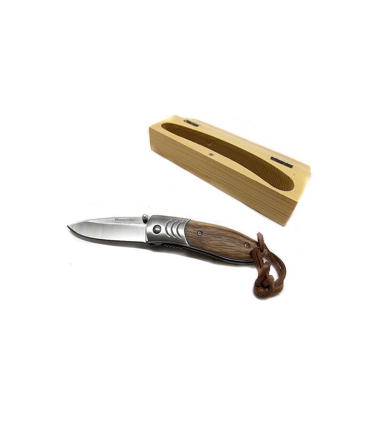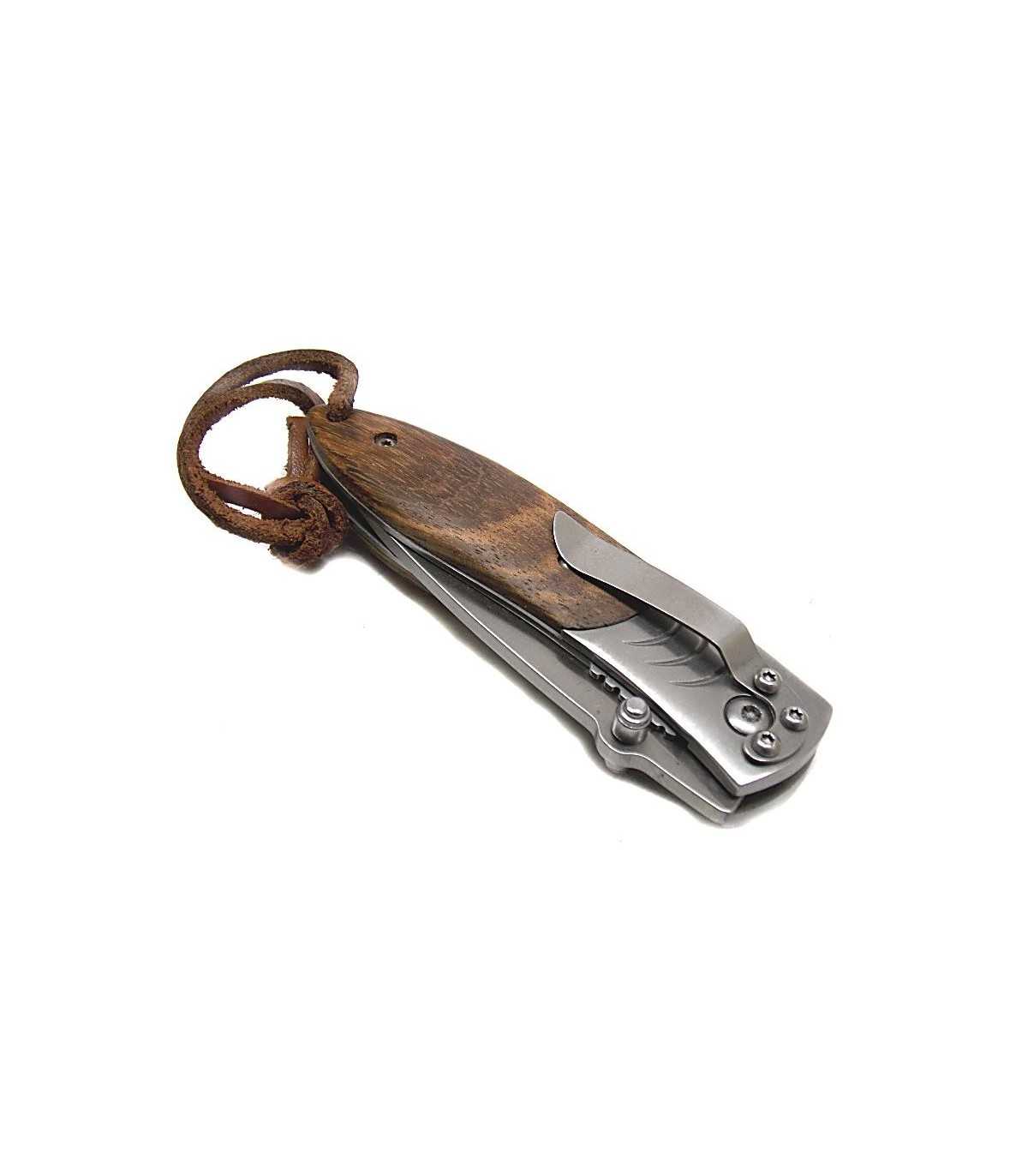 Dotato di blocco lama, di clip per metterlo alla cintura, di laccetto in cuoio, di custodia sagomata all interno in legno