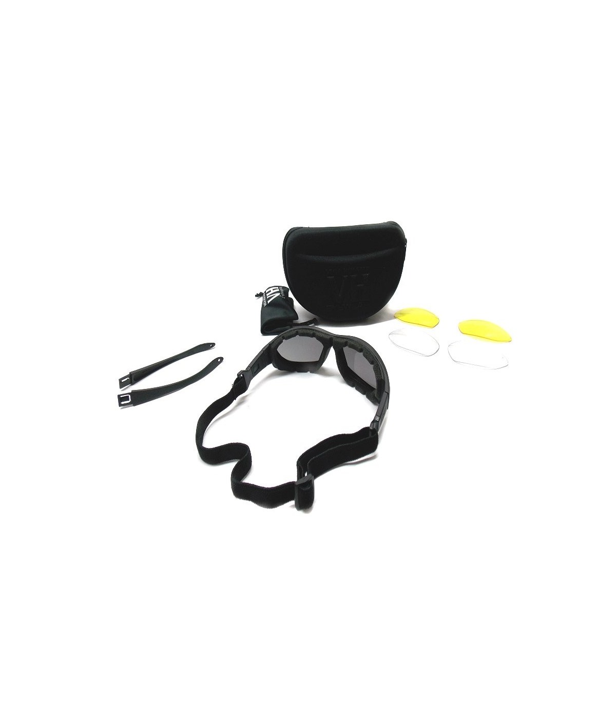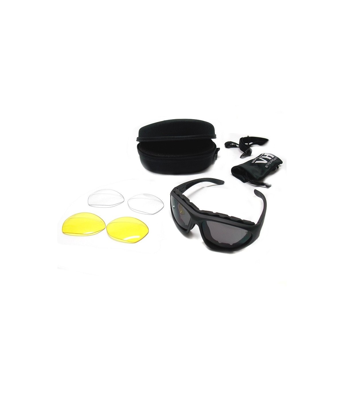 Gli occhiali sono provvisti di tre lenti di colore diverso: trasparente,grigia e gialla da poter intercambiare a seconda delle esigenze