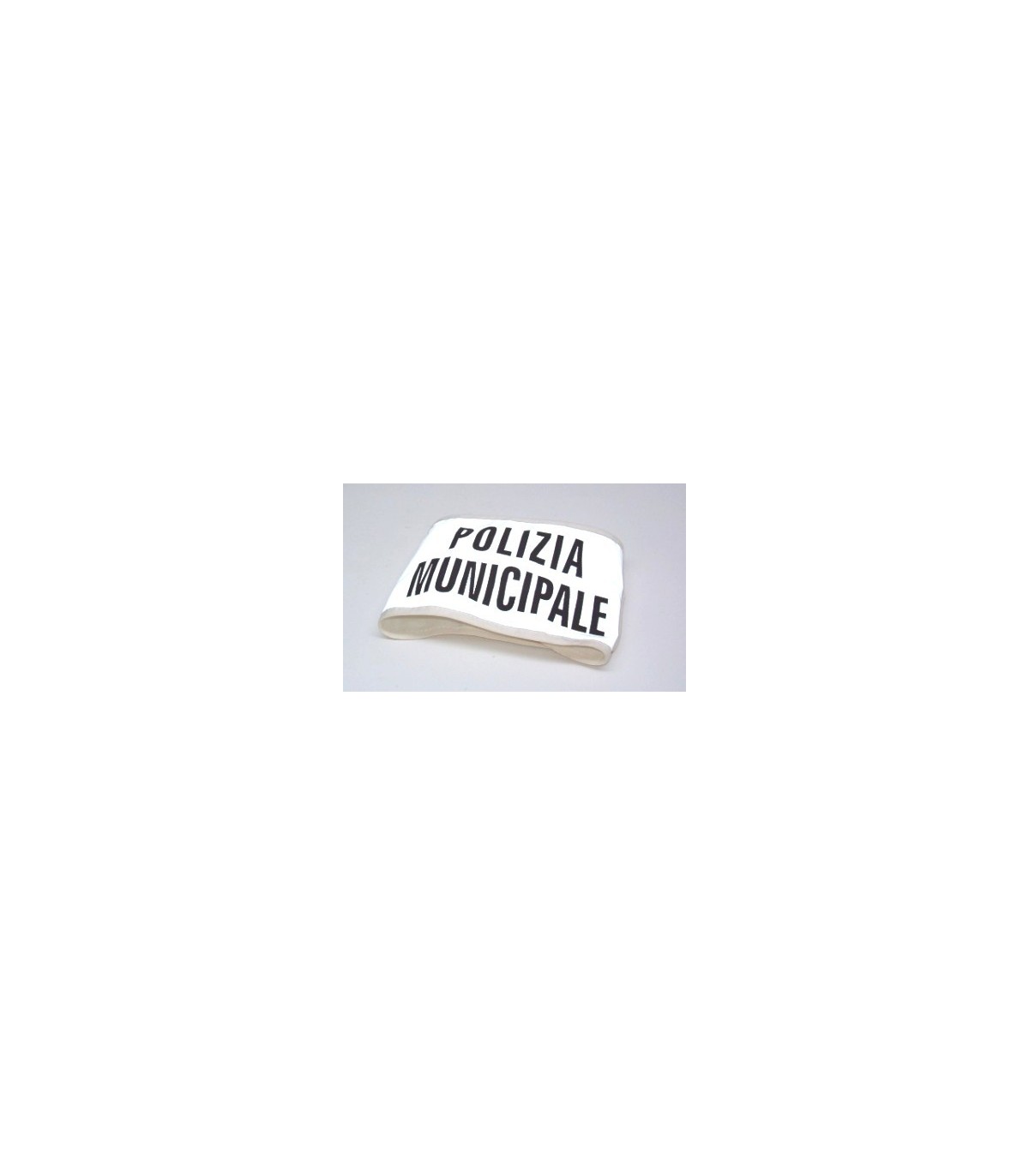 Fascia in tessuto rifrangente bianco larga 13,5 cm e lunga 48 cm con scritta nera Polizia municipale.